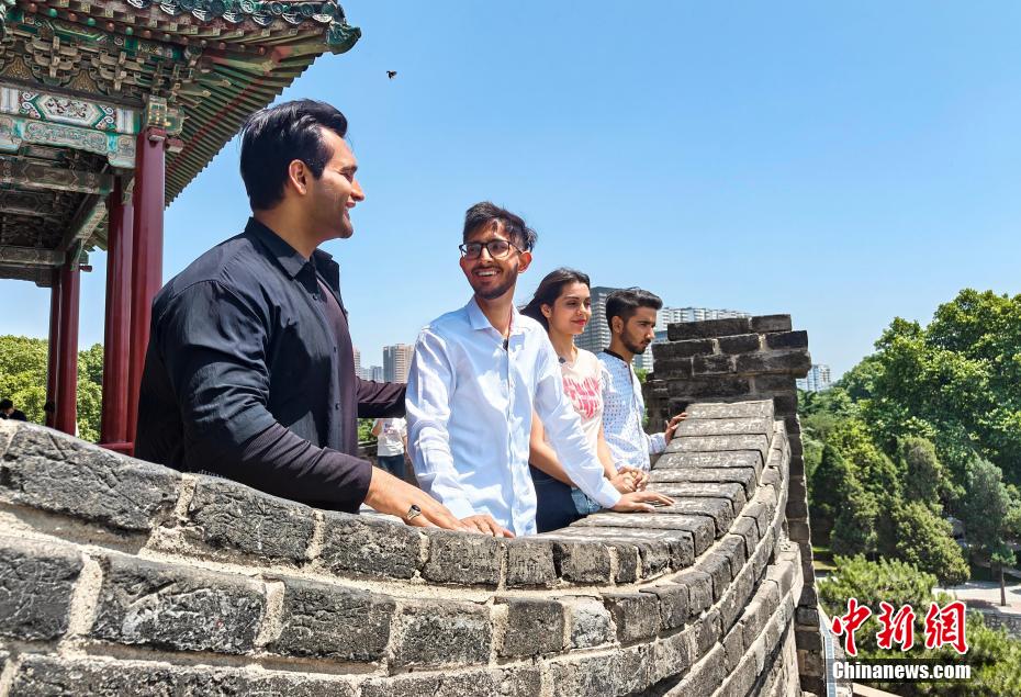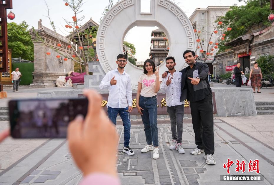 邯森等4名巴基斯坦留学生在回车巷历史文化街区拍照留念。