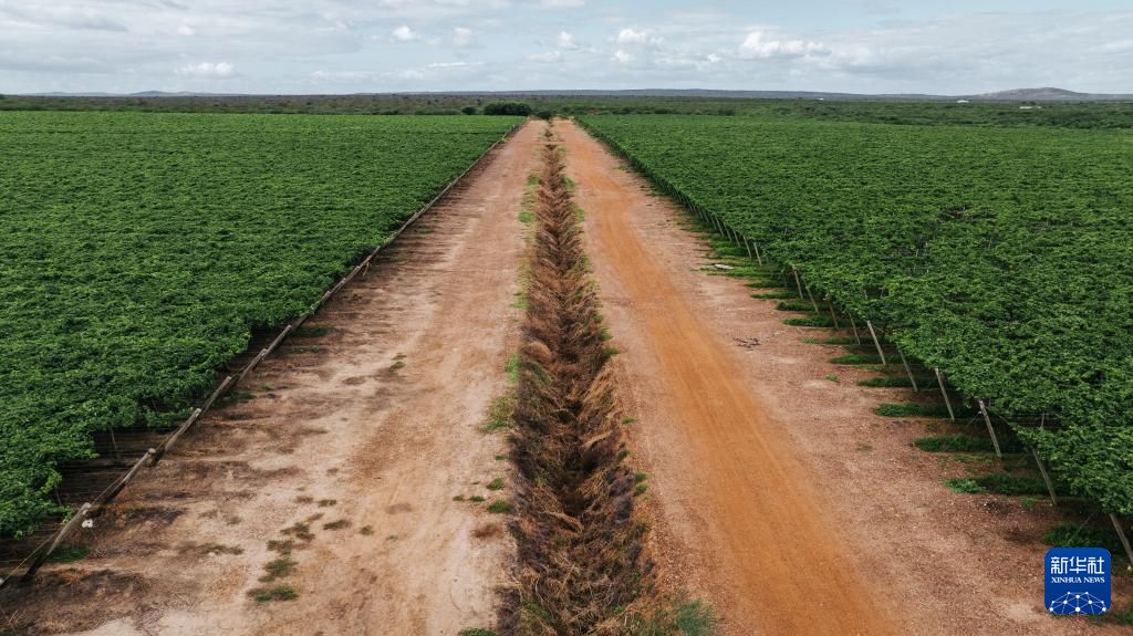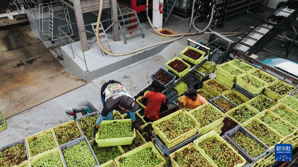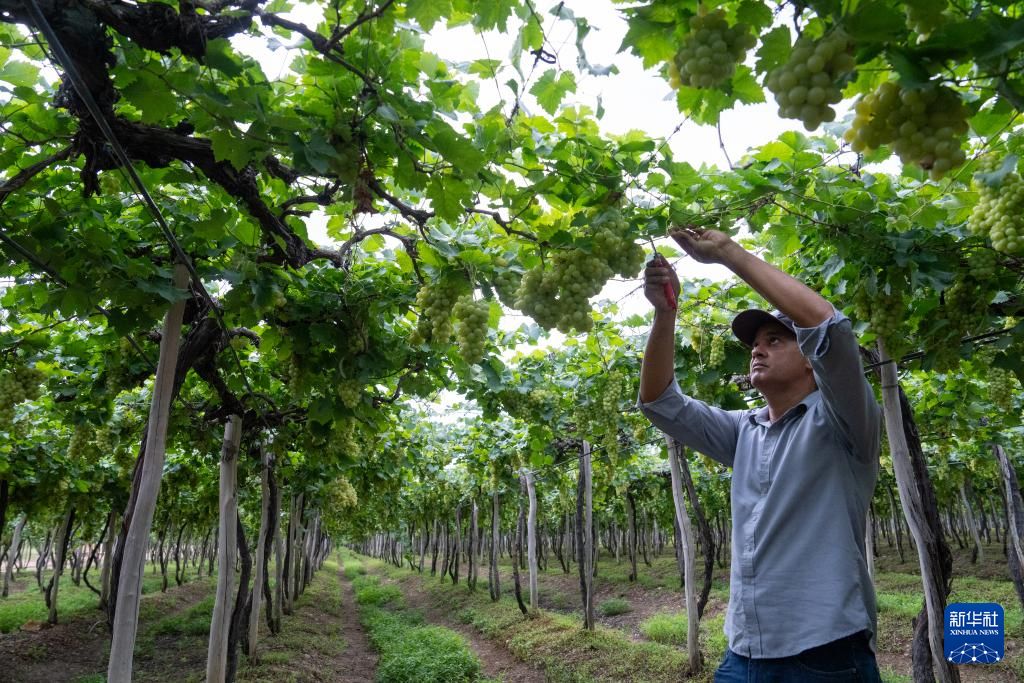 位于南纬9度左右的巴西圣弗朗西斯科河谷已经成为该国主要葡萄酒产区之一。创立于1989年的米奥罗葡萄酒集团是巴西最大的葡萄酒企业。2001年,这家位于巴西南部传统葡萄酒产区的企业开始探索新产区,最终在基地4000公里外的圣弗朗西斯科河谷落户了他们的第四个葡萄园,并命名为“新大地”酒庄。图为5月22日,在巴西圣弗朗西斯科河谷的米奥罗葡萄酒集团“新大地”酒庄,工作人员检查葡萄长势。