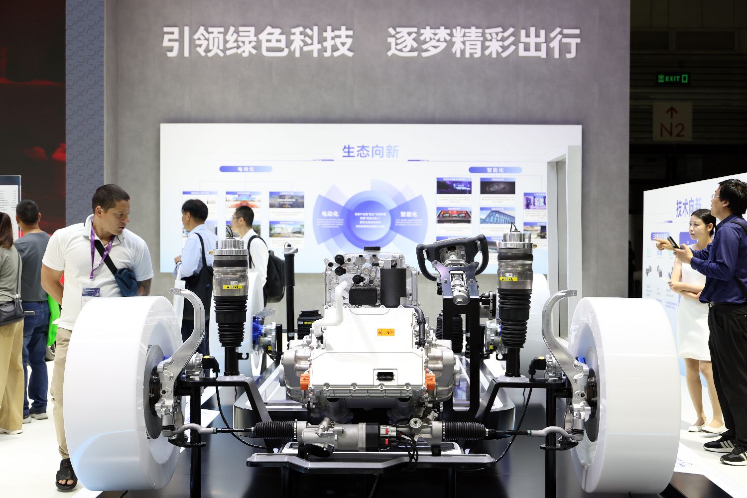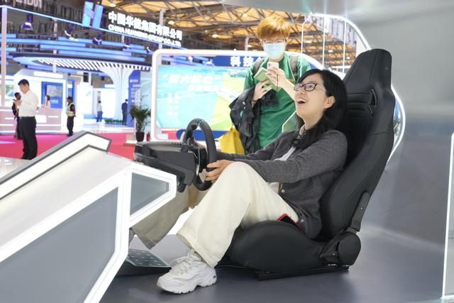 观众体验电动汽车虚拟驾驶舱,感受低碳出行。中国日报网