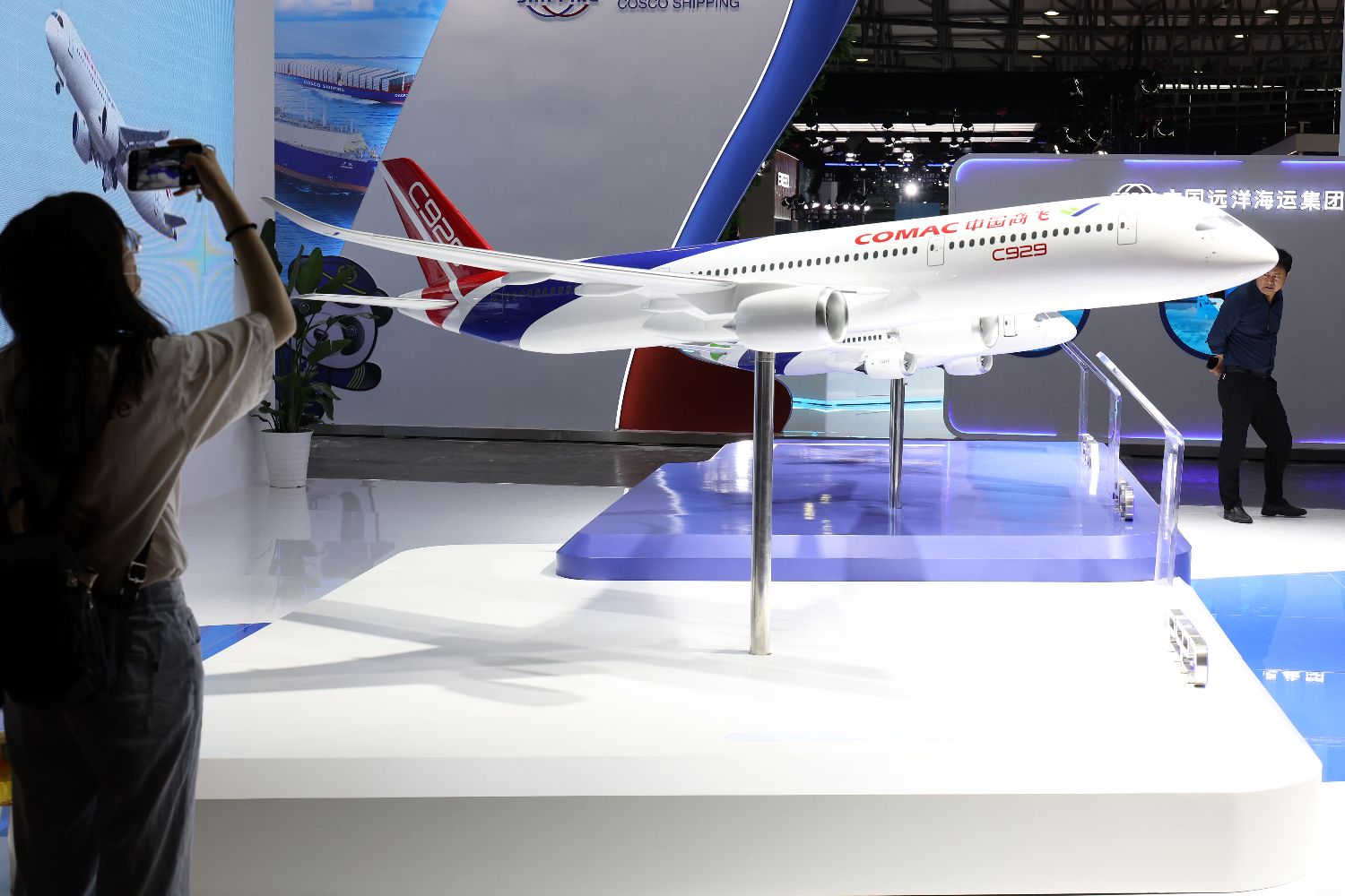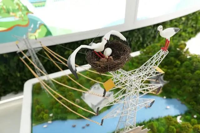 碳博会上展示的“候鸟生命线”模型沙盘,还原扬州高邮东方白鹳保护地内白鹳在输电铁塔上生存繁衍的情景。中国日报网