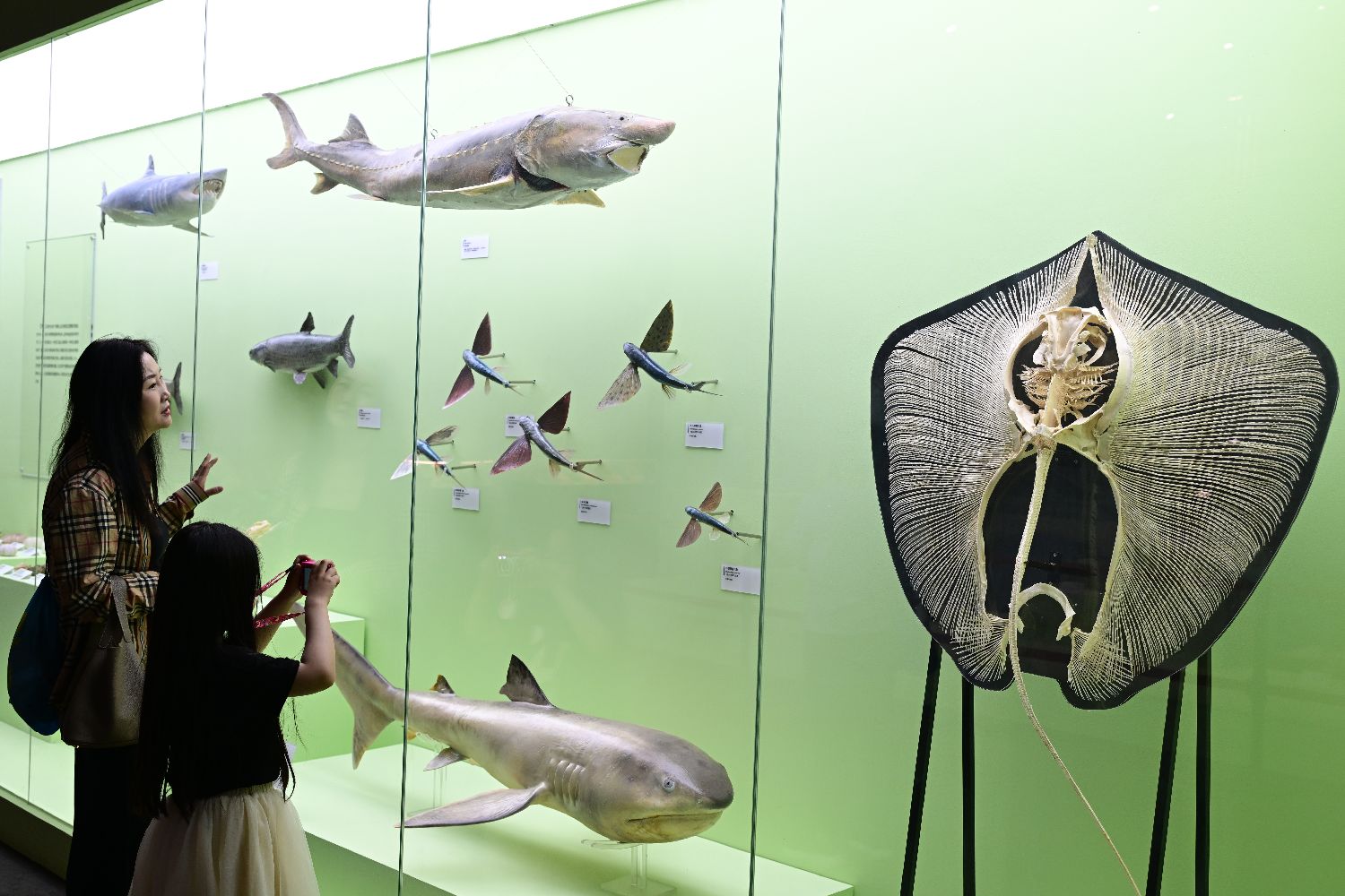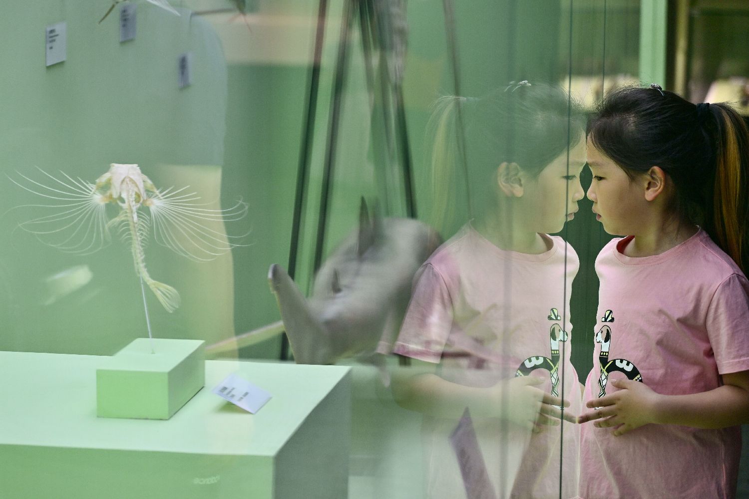 6月5日,小朋友在观看展出的东方豹鲂鮄骨骼标本。中新社