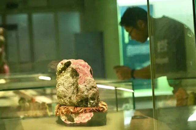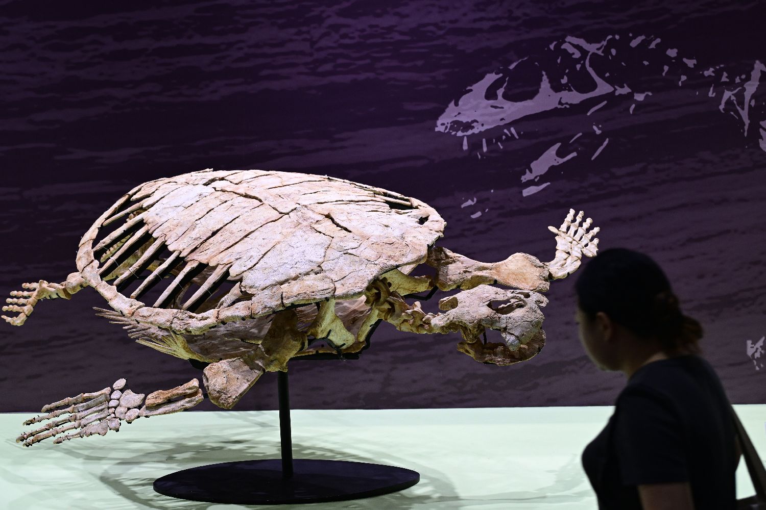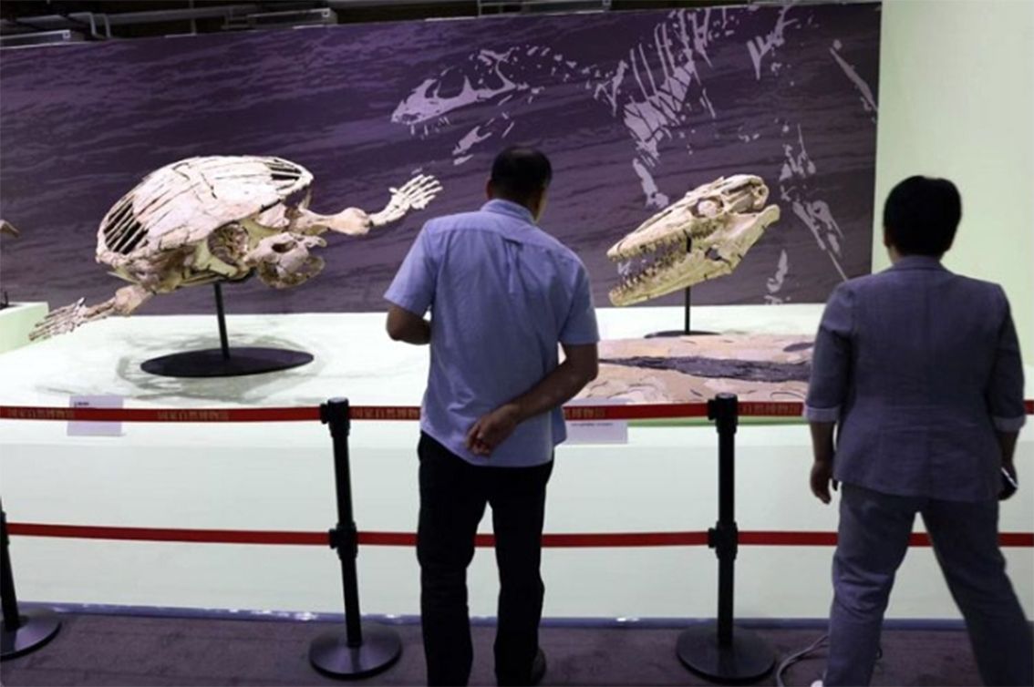 6月5日,参观者在观看展出的塞氏异龟化石。中新社