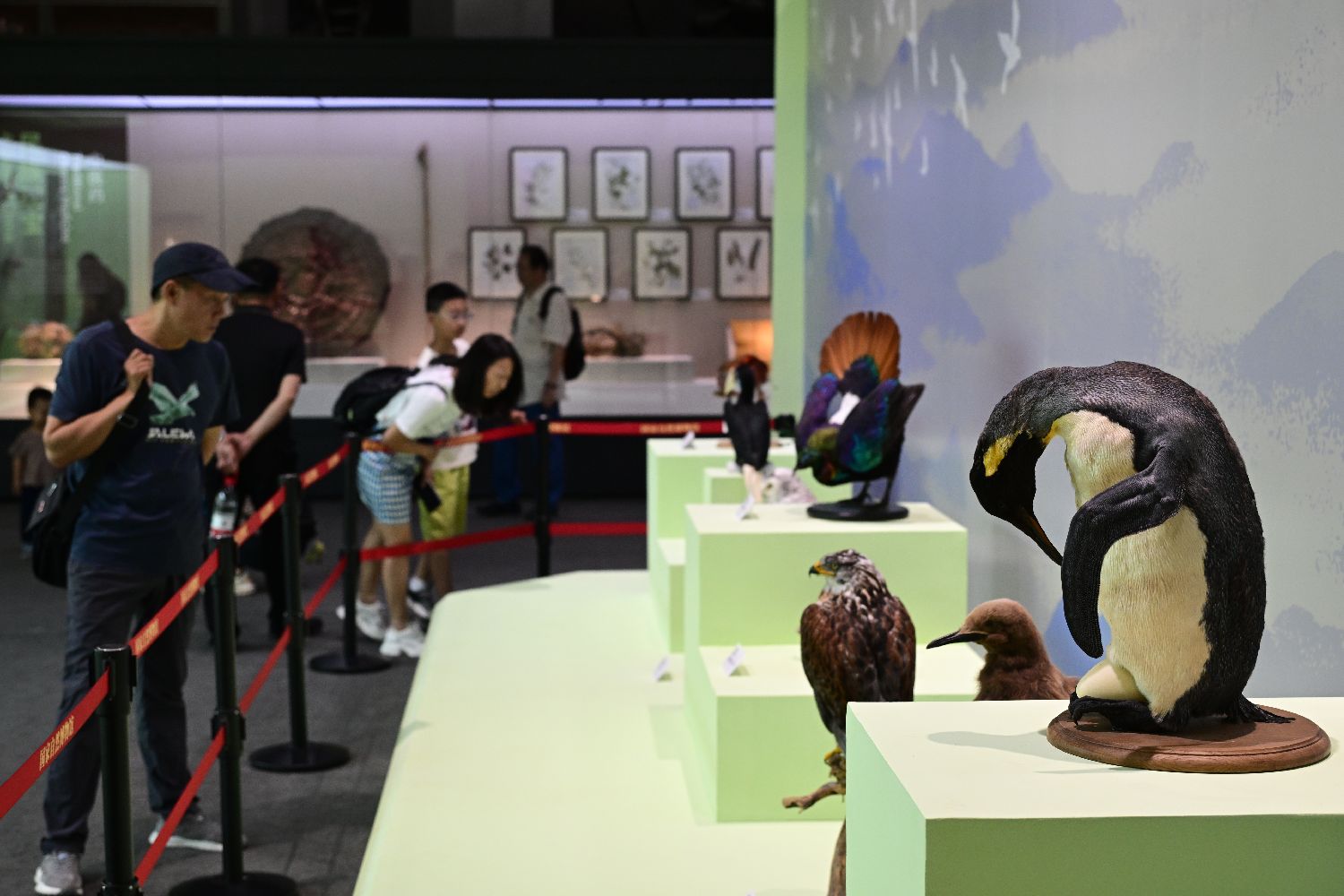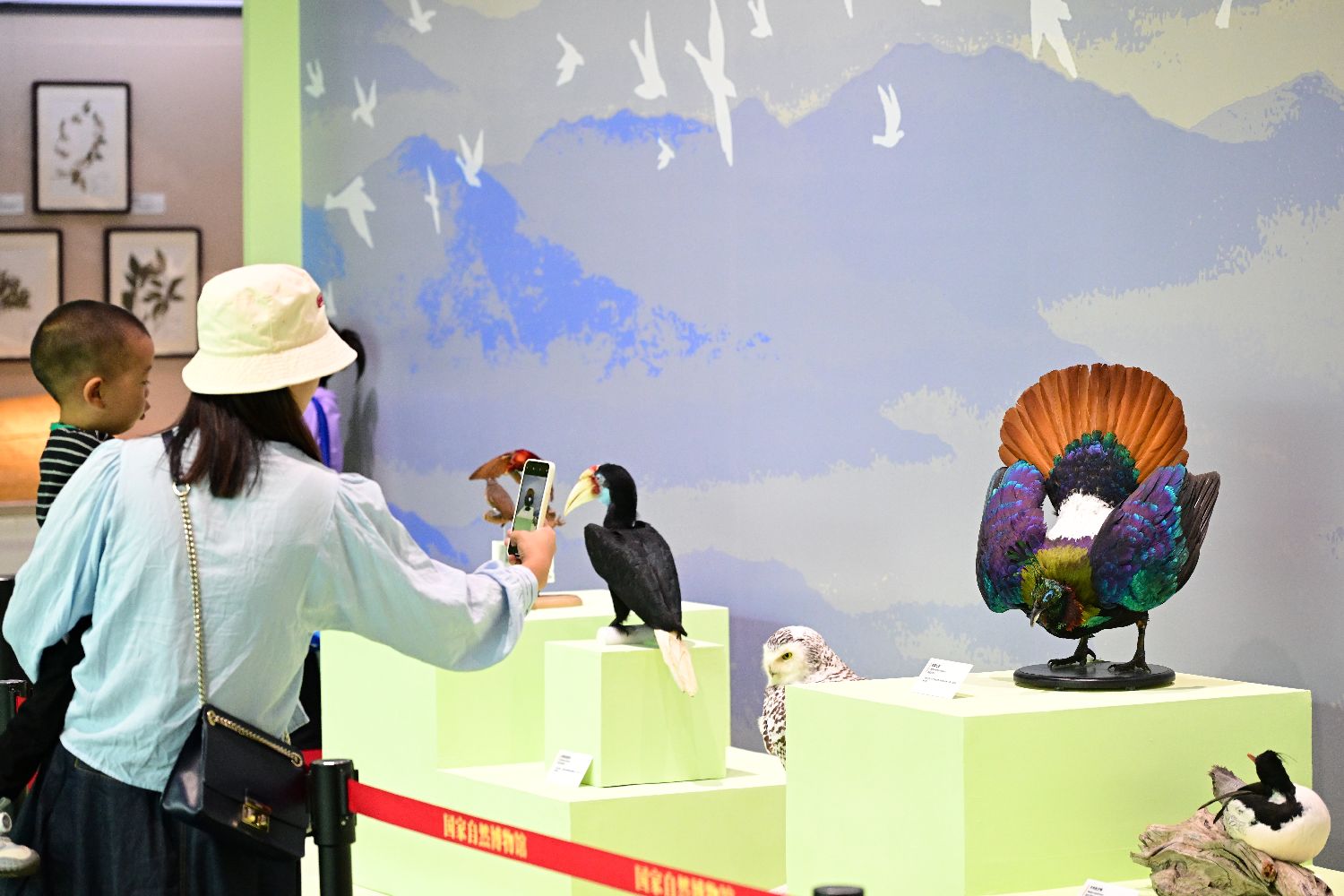 6月5日,家长带小朋友在观看展出的棕尾虹雉(右)标本。中新社