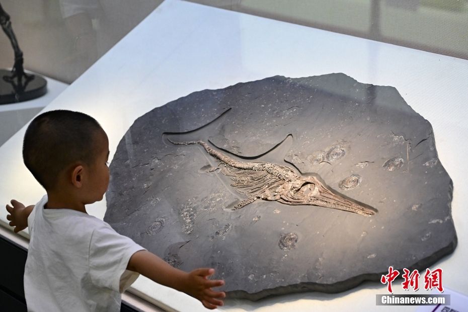 6月5日,小朋友在观看展出的四裂狭鳍鱼龙化石。中新网