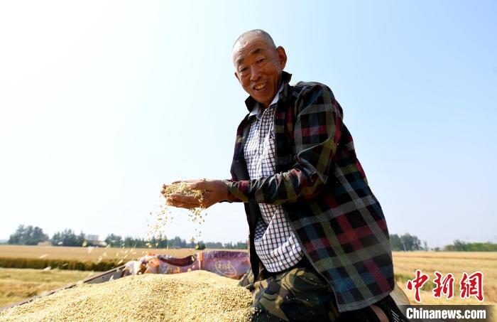 6月6日,河北省衡水市阜城县建桥乡东倪村村民展示收获的小麦。中新网