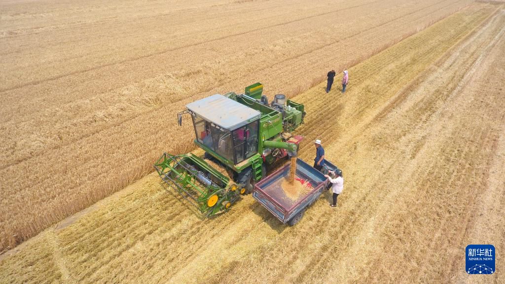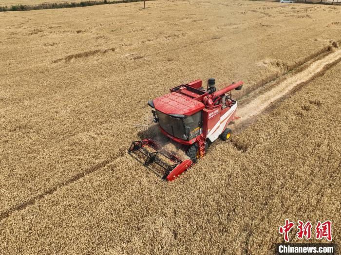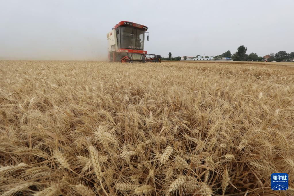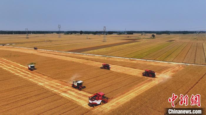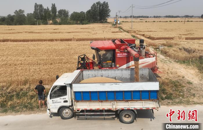 6月6日,联合收割机在河北省衡水市枣强县的麦田里来回穿梭,收割、脱粒、装车一气呵成。中新网