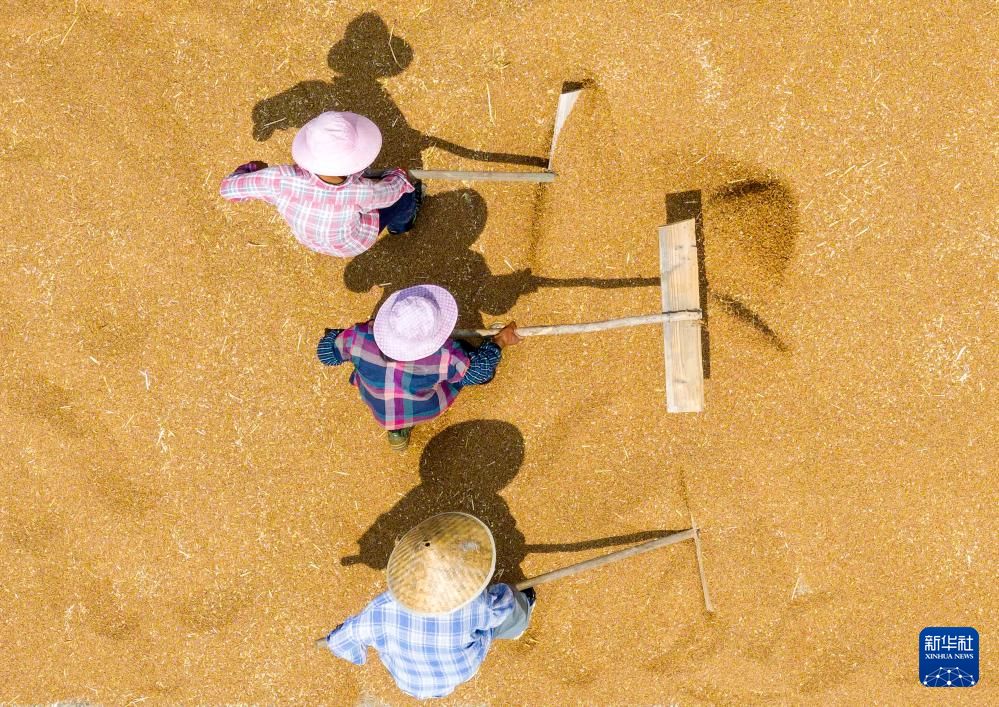 截至6月5日,中国各地冬小麦已收1.9亿亩、收获进度57%,比去年同期快17.7个百分点。当前,冬小麦机收正由南向北加快推进,四川、湖北麦收已结束,安徽、河南进度过九成,陕西过四成,江苏、山东、河北、山西等省份即将进入收获高峰。图为6月6日,农民在江苏省泰州市海陵区苏陈镇北庄村翻晒小麦(无人机照片)。新华社