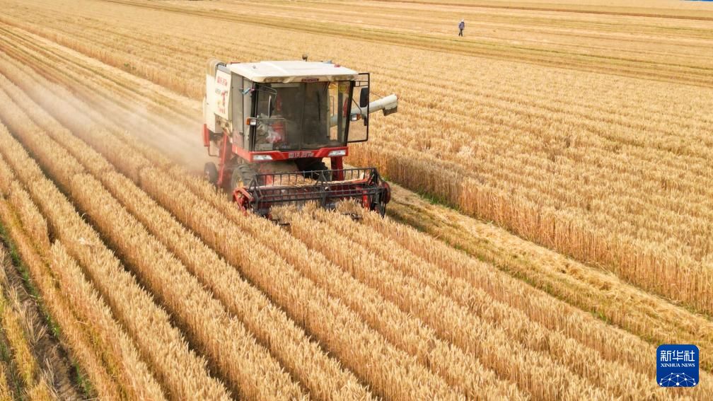 6月6日,河南省焦作市温县北冷乡陈卜庄村村民驾驶收割机收获小麦。新华社