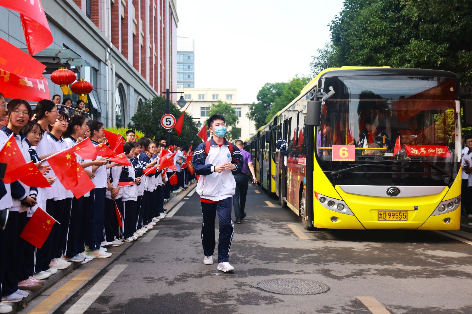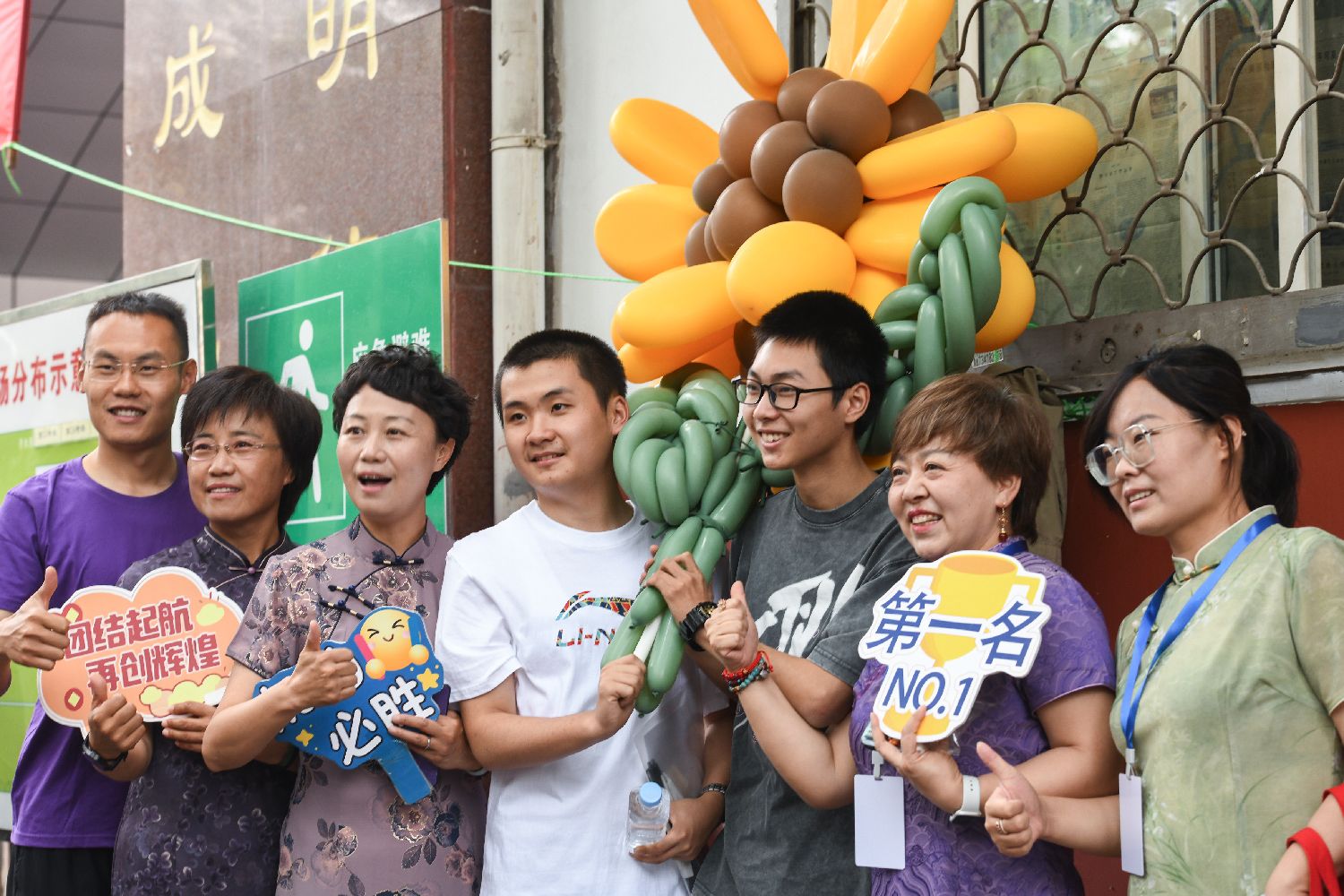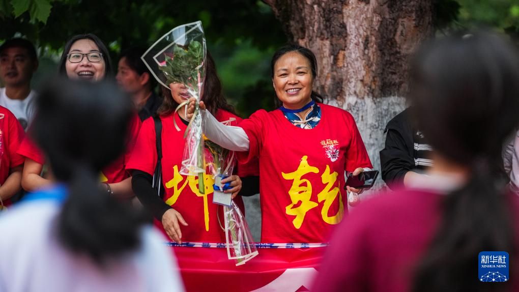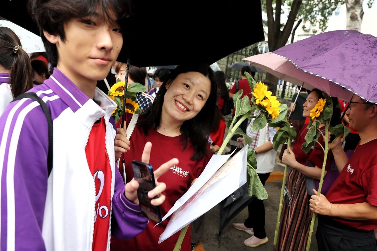 6月7日,北京市第八十中学望京校区考点,老师举着向日葵(寓意“一举夺魁”)为学生加油送考。中国日报网