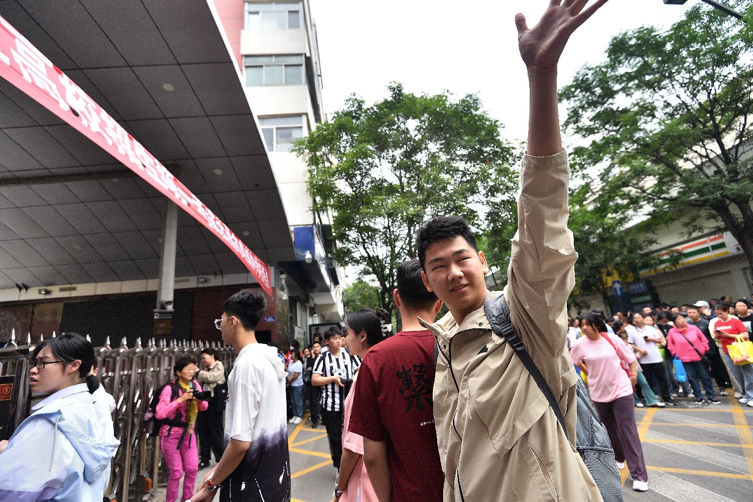 6月7日,山西太原,一名高考生进考点前向家长、老师挥手致意。中新社
