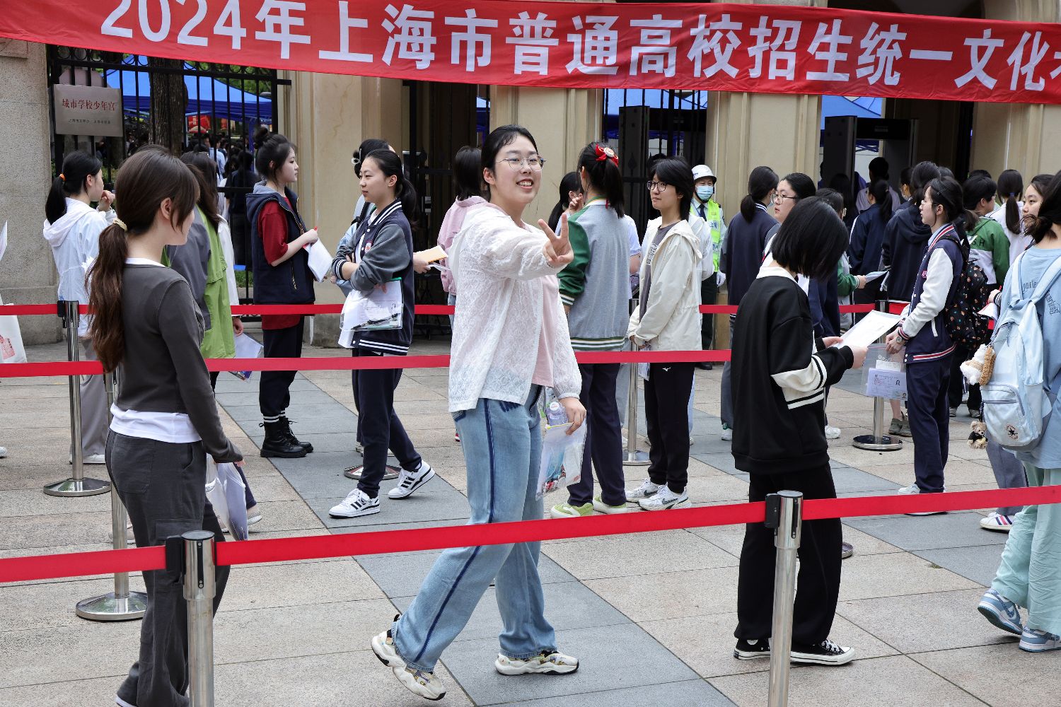 6月7日,上海,一名等待进入考场的学生做出胜利的手势。据上海市教育考试院消息,上海今年约5.4万名考生参加考试。中新社