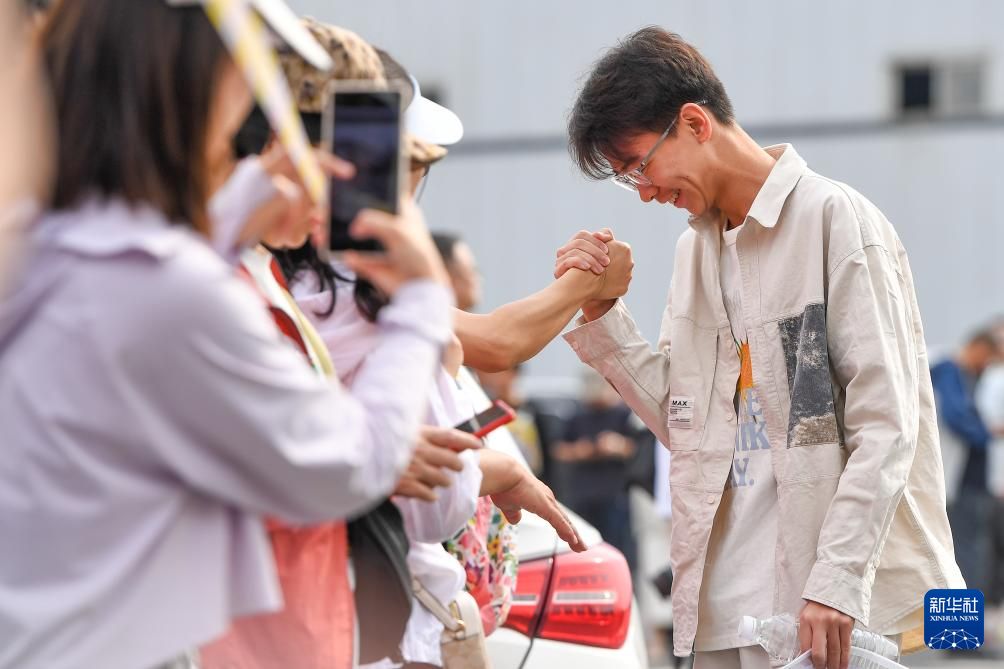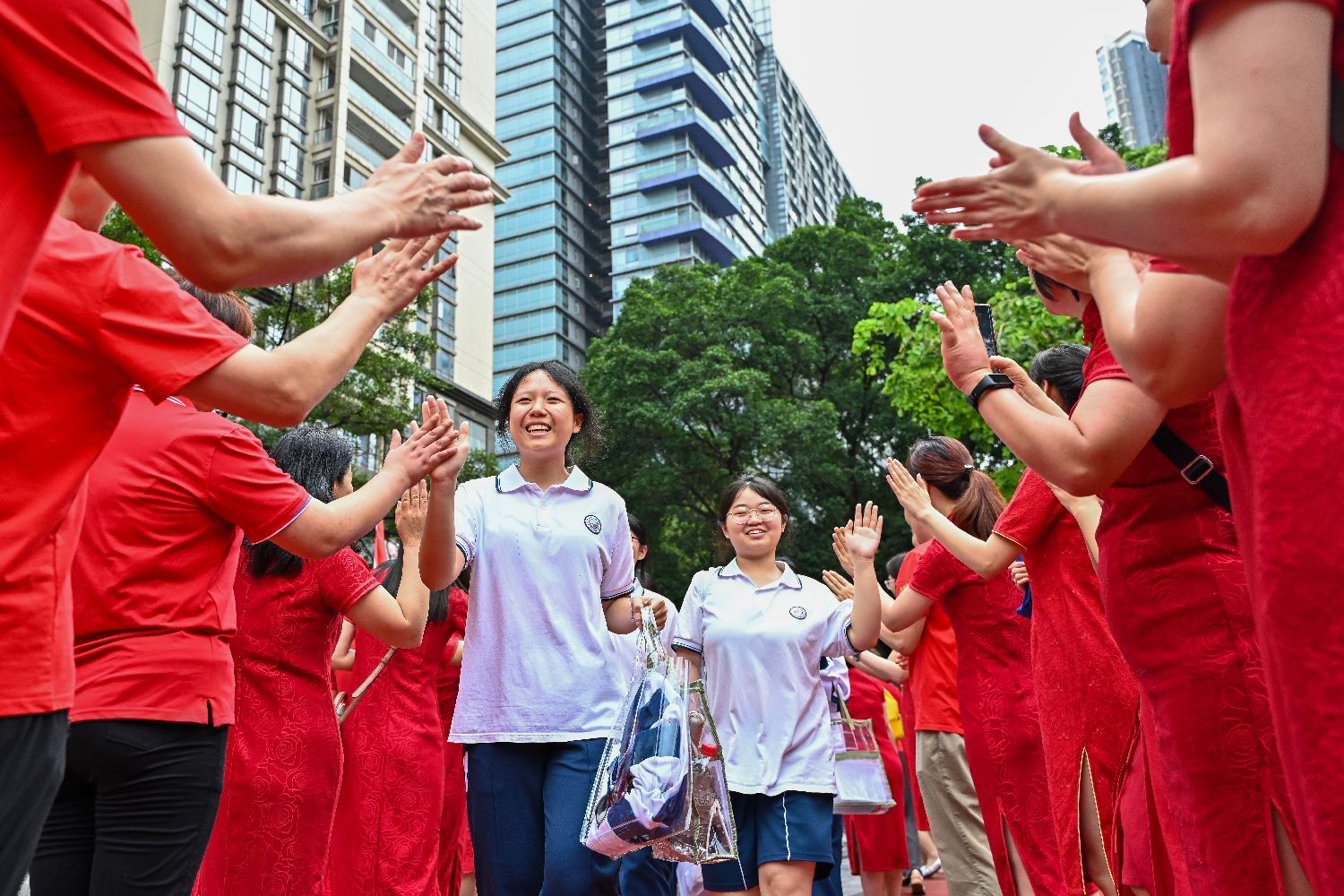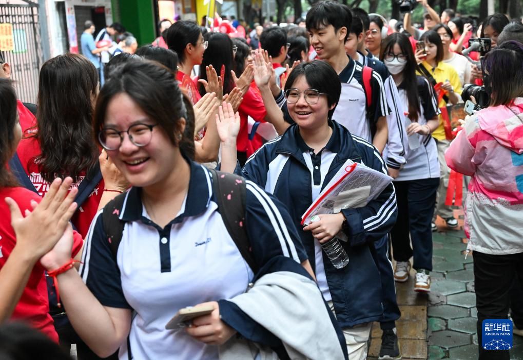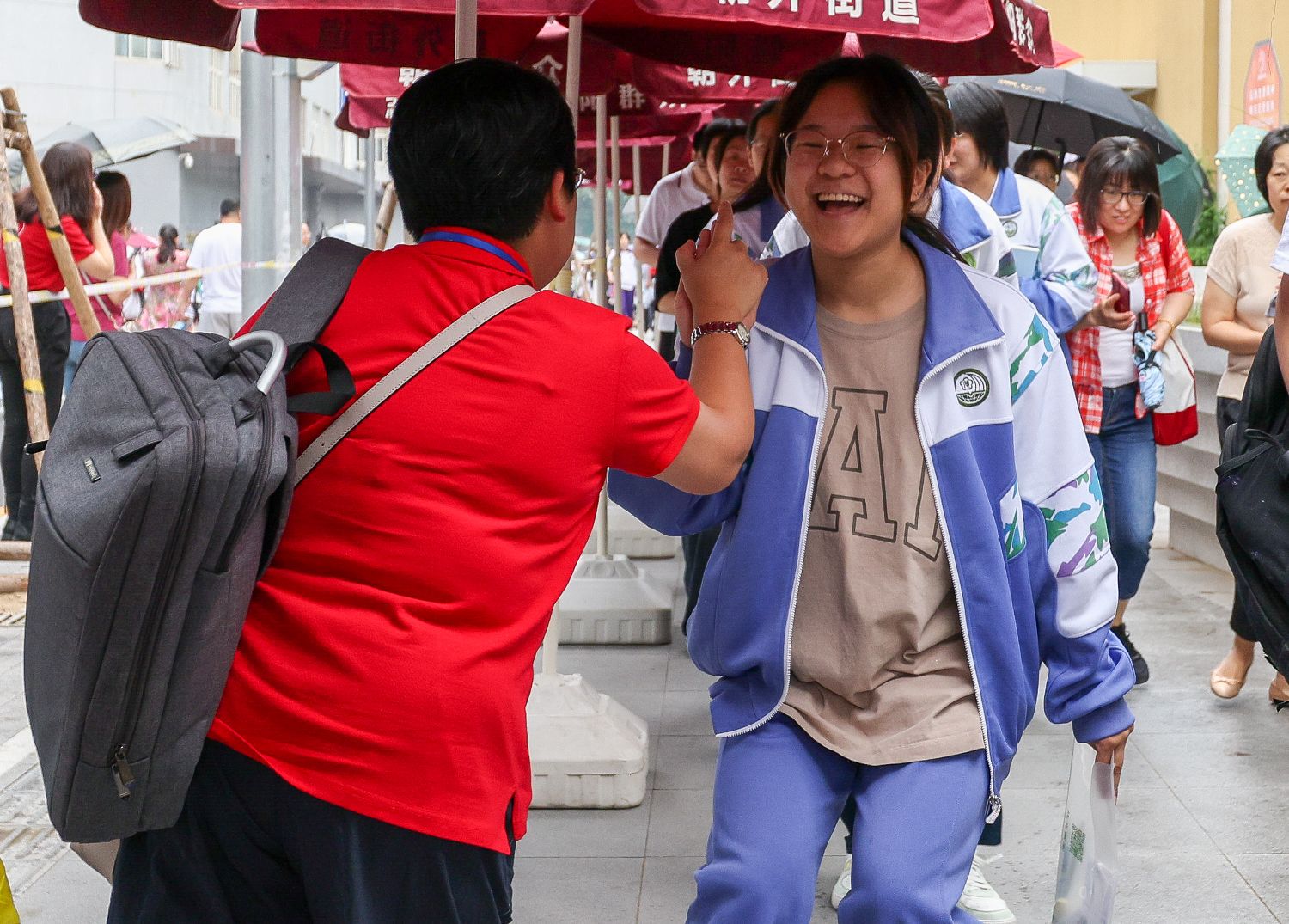 6月7日,考生在广东省广州市铁一中学考点与送考老师击掌。新华社