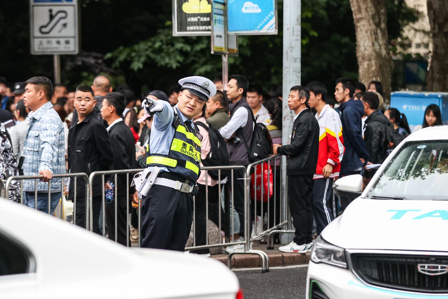 6月7日,贵州贵阳,交警在贵阳六中(云岩校区)考点外指挥交通。中新社