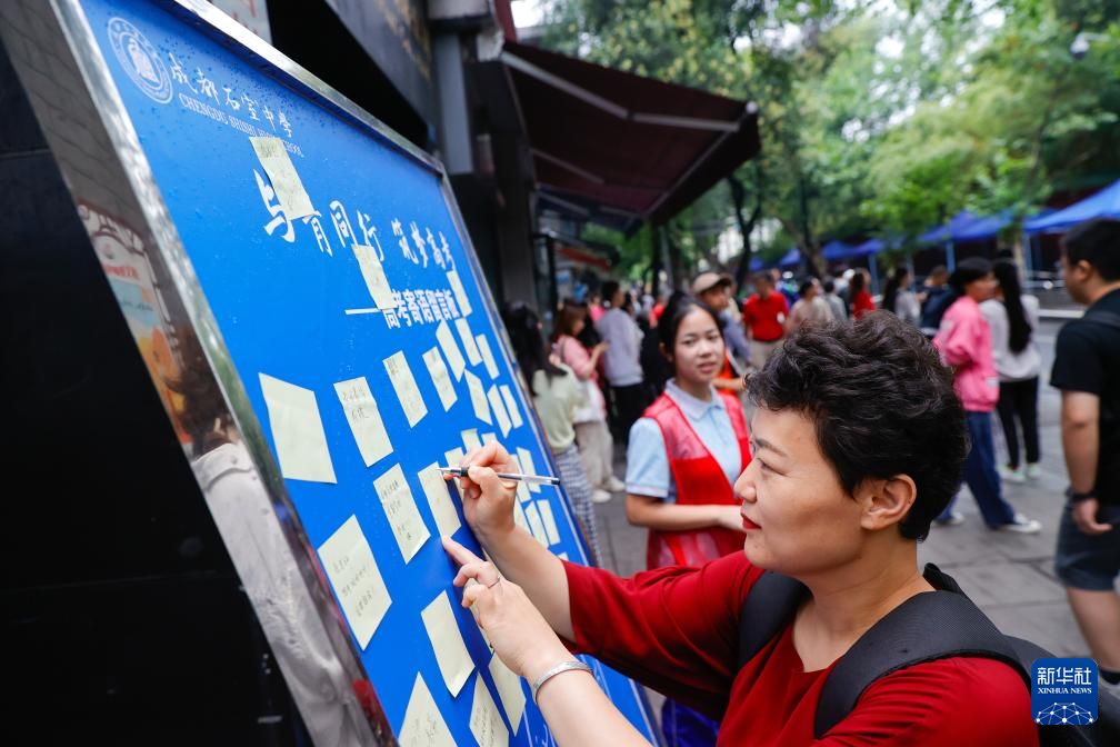6月7日,在四川成都石室中学(文庙校区)考点外,一名考生家长在高考寄语留言板上为考生留言加油。新华社