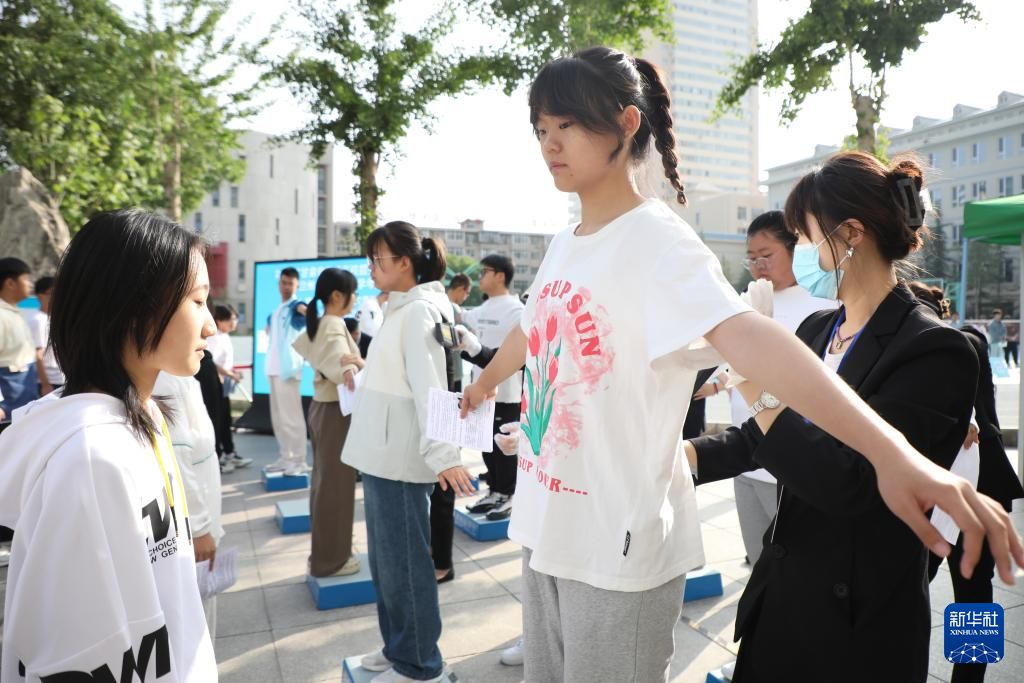 6月7日,在甘肃兰州市第十四中学考点,工作人员对考生进行考前安检。新华社