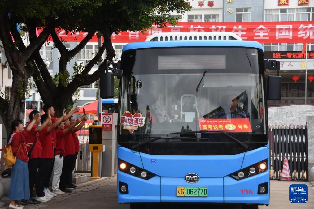 6月7日,在云南红河哈尼族彝族自治州蒙自市第一高级中学(文科)考点,老师为学生加油打气,爱心送考车送考生到红河州第一中学(理科)考点参加高考。新华社