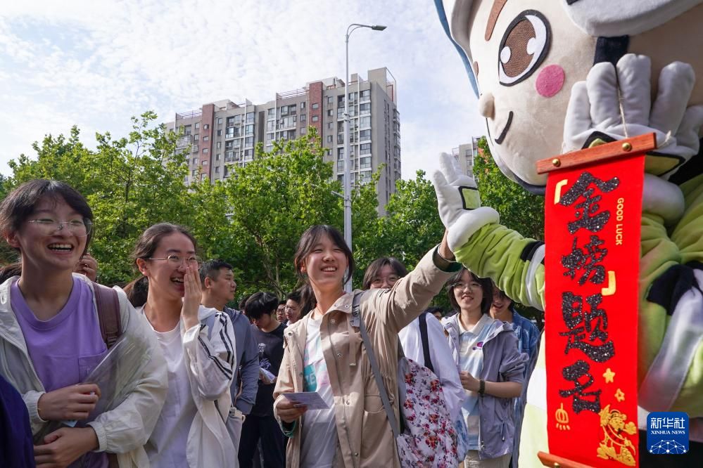 6月7日,在江苏南京市建邺区中华中学考点,考生与送考人偶击掌。新华社