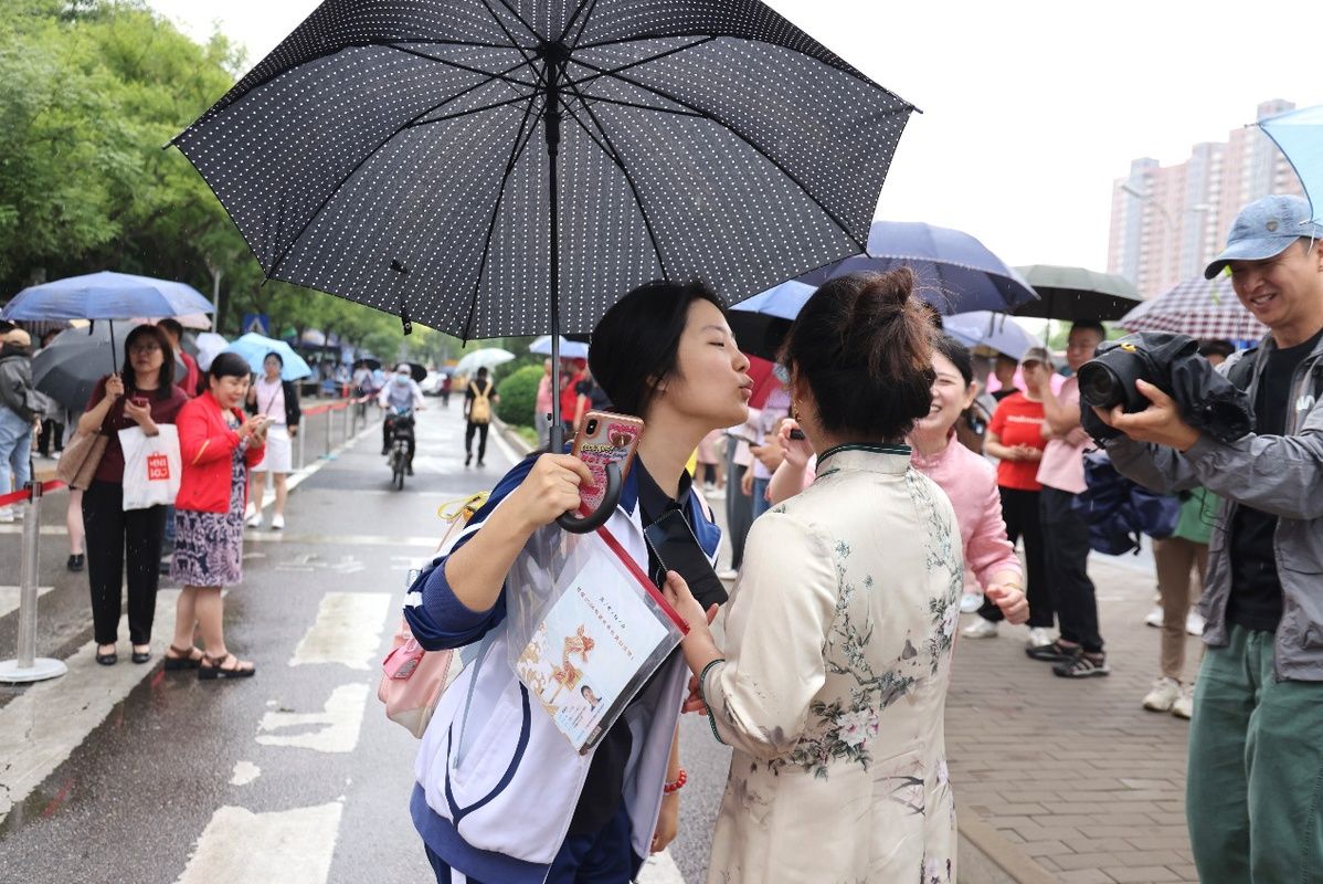 6月7日,中国人民大学附属中学朝阳学校考点,考生进入考场前向家人表达爱意。中国日报网