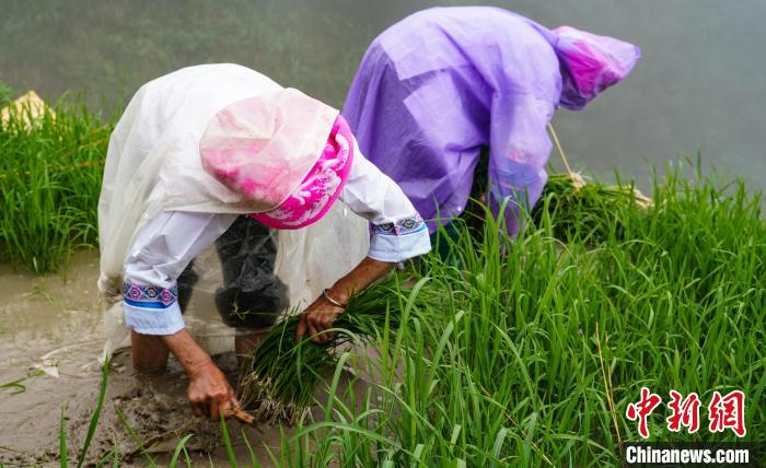 壮寨村民在秧田里拔苗梳秧。中新网