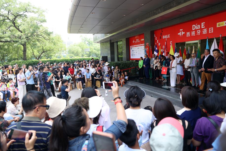 2024年6月8日,一年一度的“西班牙语日”在北京塞万提斯学院举行。来自西班牙、哥伦比亚、智利、阿根廷、秘鲁、厄瓜多尔等国家人们相聚一起,他们带来了各具特色的经典美食特产、风情文化节目,分享西班牙语及西语国家文化带来的欢乐。图为来自各国的嘉宾参加“西班牙语日”活动开幕仪式。 李久骏摄
