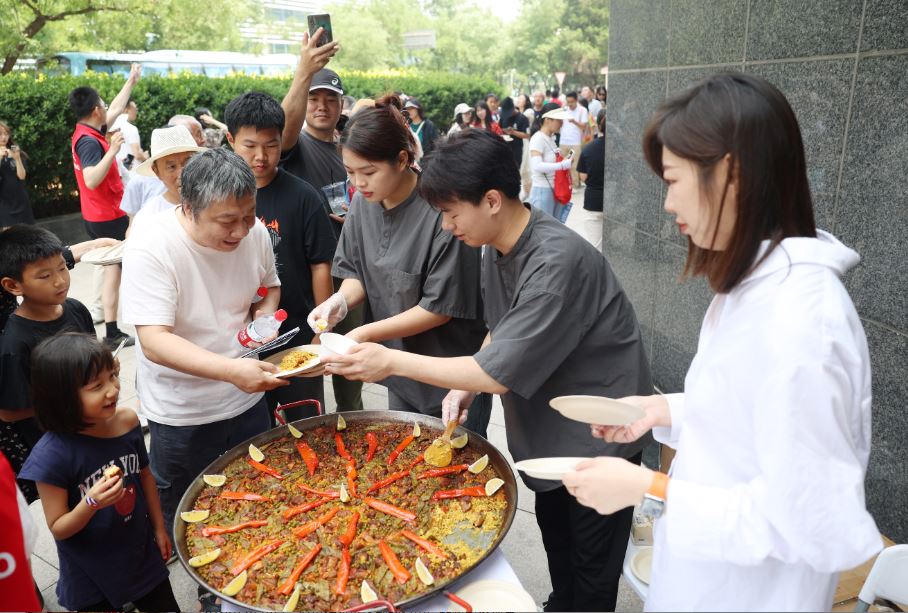 2024年6月8日,参加活动的人们排队品尝西班牙烩饭。 李久骏摄
