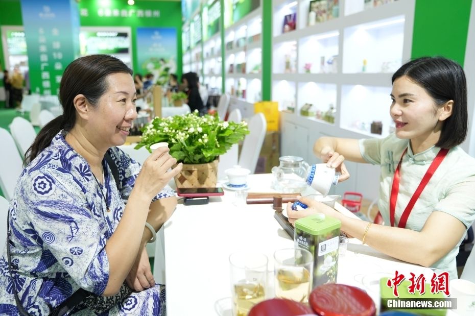 6月9日,市民品尝展商冲泡的茉莉花茶。中新网