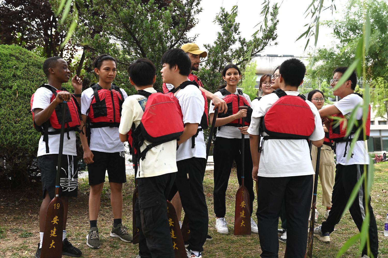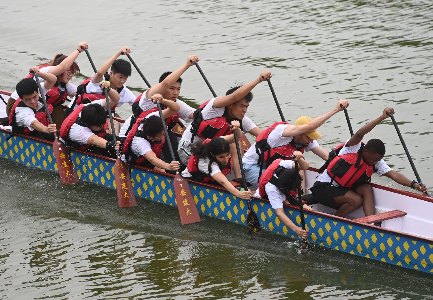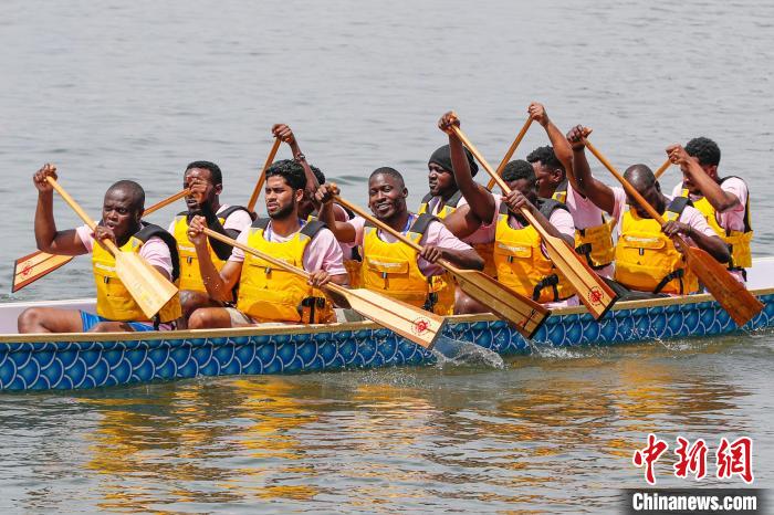 6月8日,在安徽合肥,安徽建筑大学的留学生和同学们一起进行龙舟训练。中新社