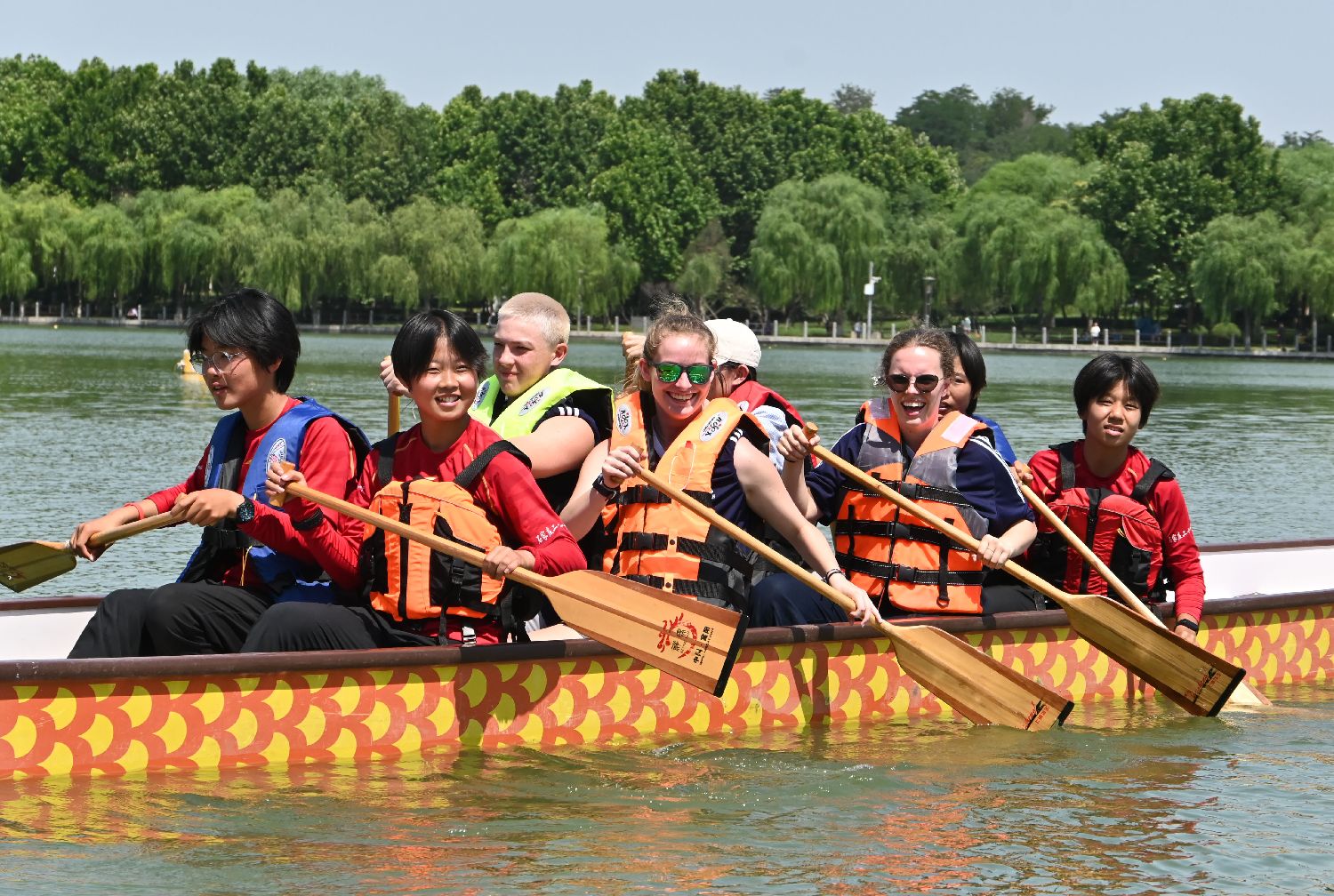 赛龙舟是端午节必不可少的欢庆活动之一,现在也越来越受到国际友人的喜爱,他们纷纷加入或举办龙舟赛活动。 6月10日端午节,河北石家庄,来自美国艾奥瓦州的数十名中学生与石家庄外国语学校学生结伴参加迎端午划龙舟活动,美国学生通过划龙舟体验中国端午节传统体育竞技,感受中国传统文化。图为中美学生体验划龙舟。中新社