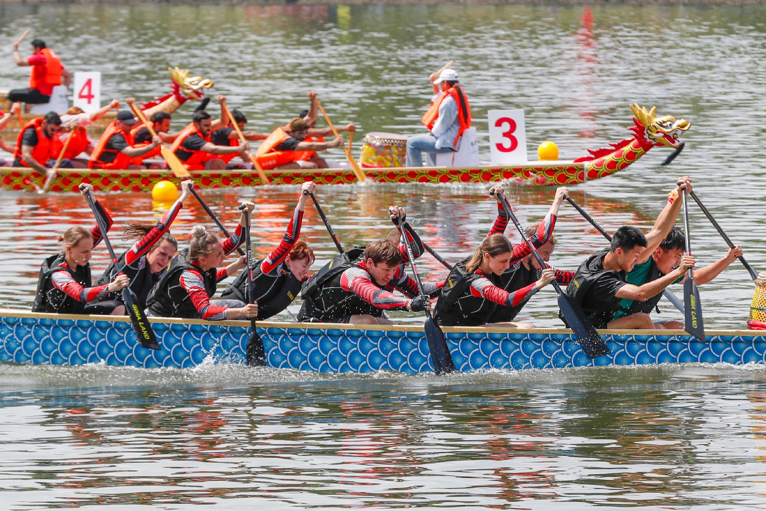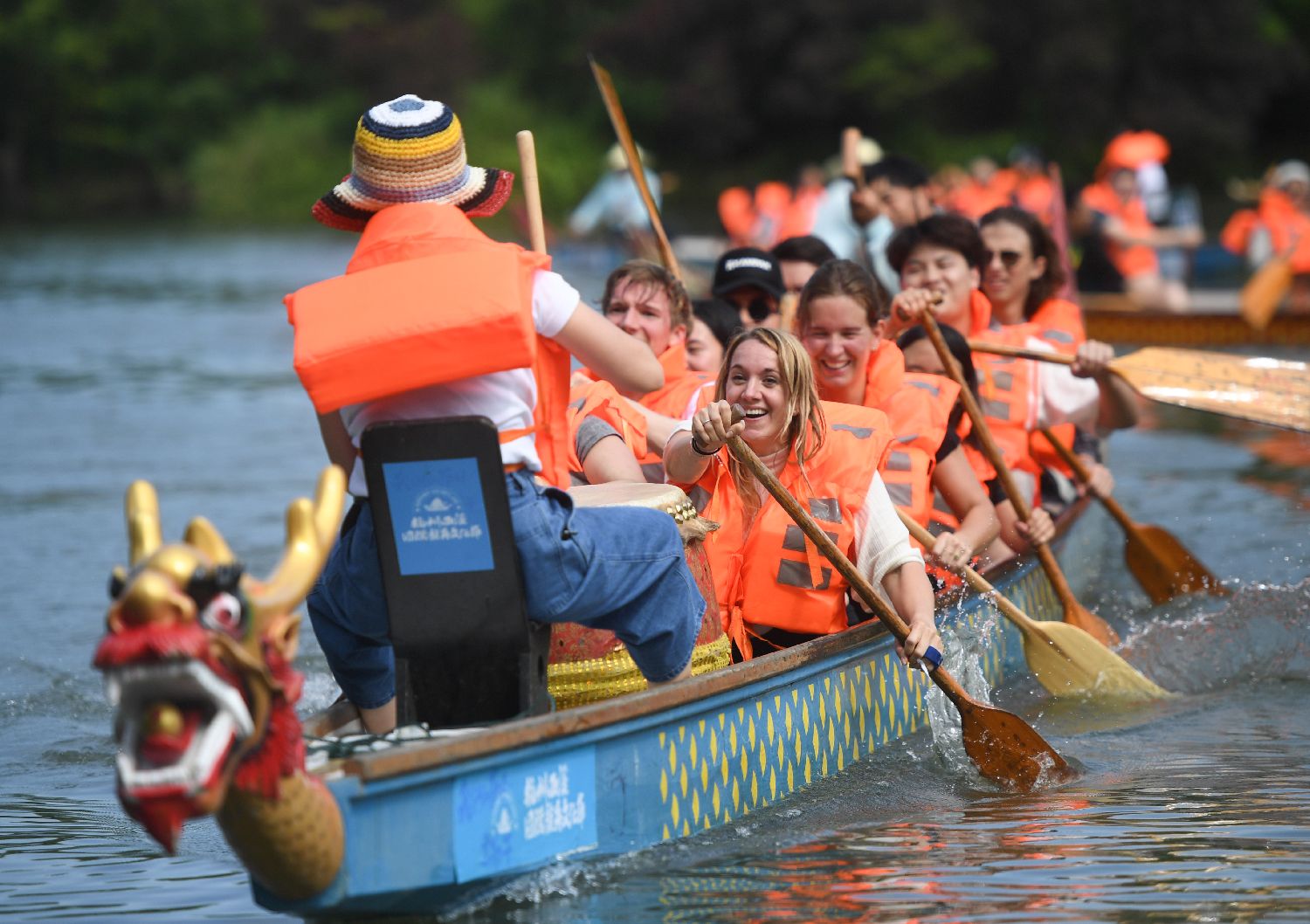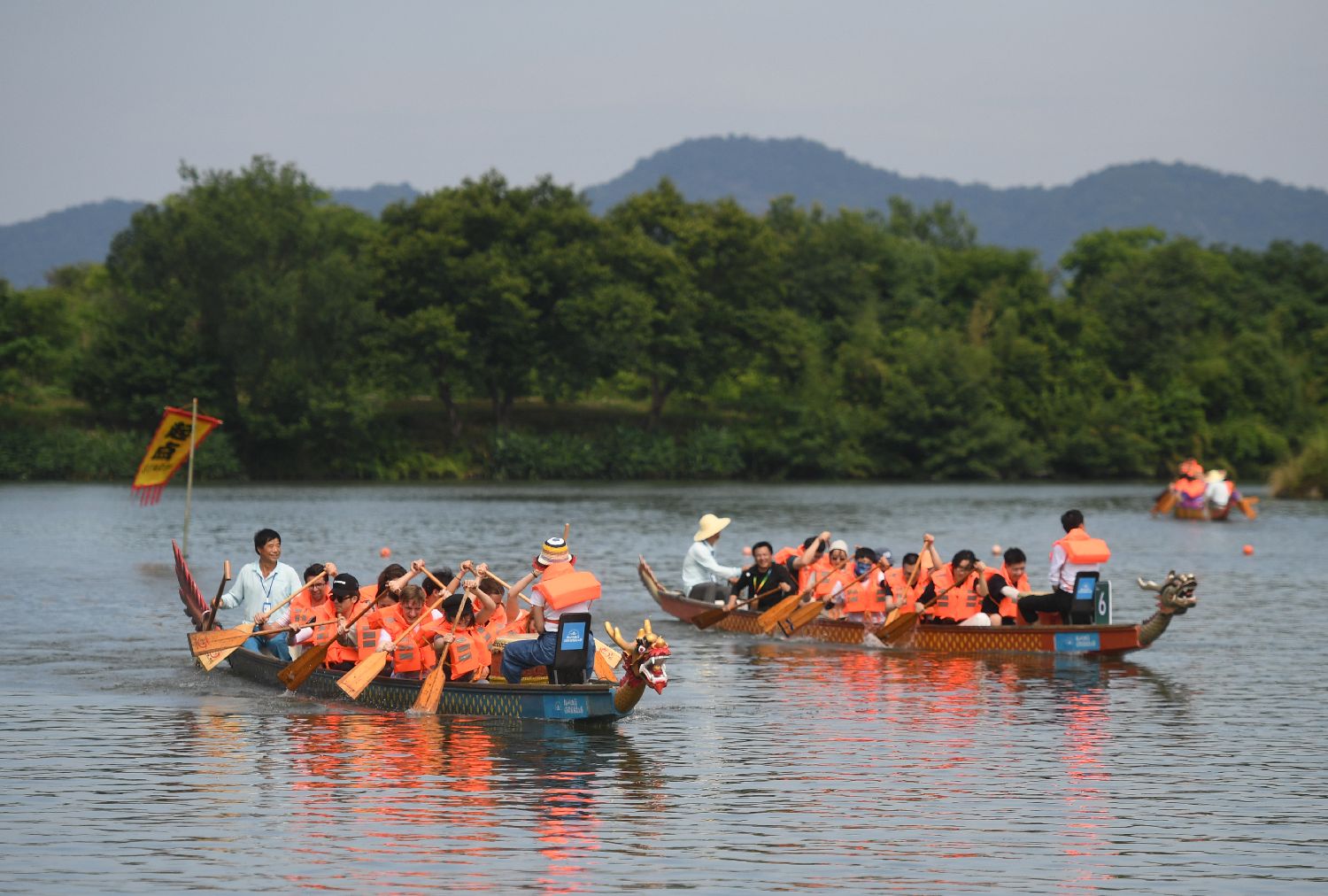6月9日,来自俄罗斯、奥地利、荷兰等10余个国家和地区的龙舟爱好者(左),在浙江杭州西溪湿地进行龙舟训练,感受中国端午习俗。中新社