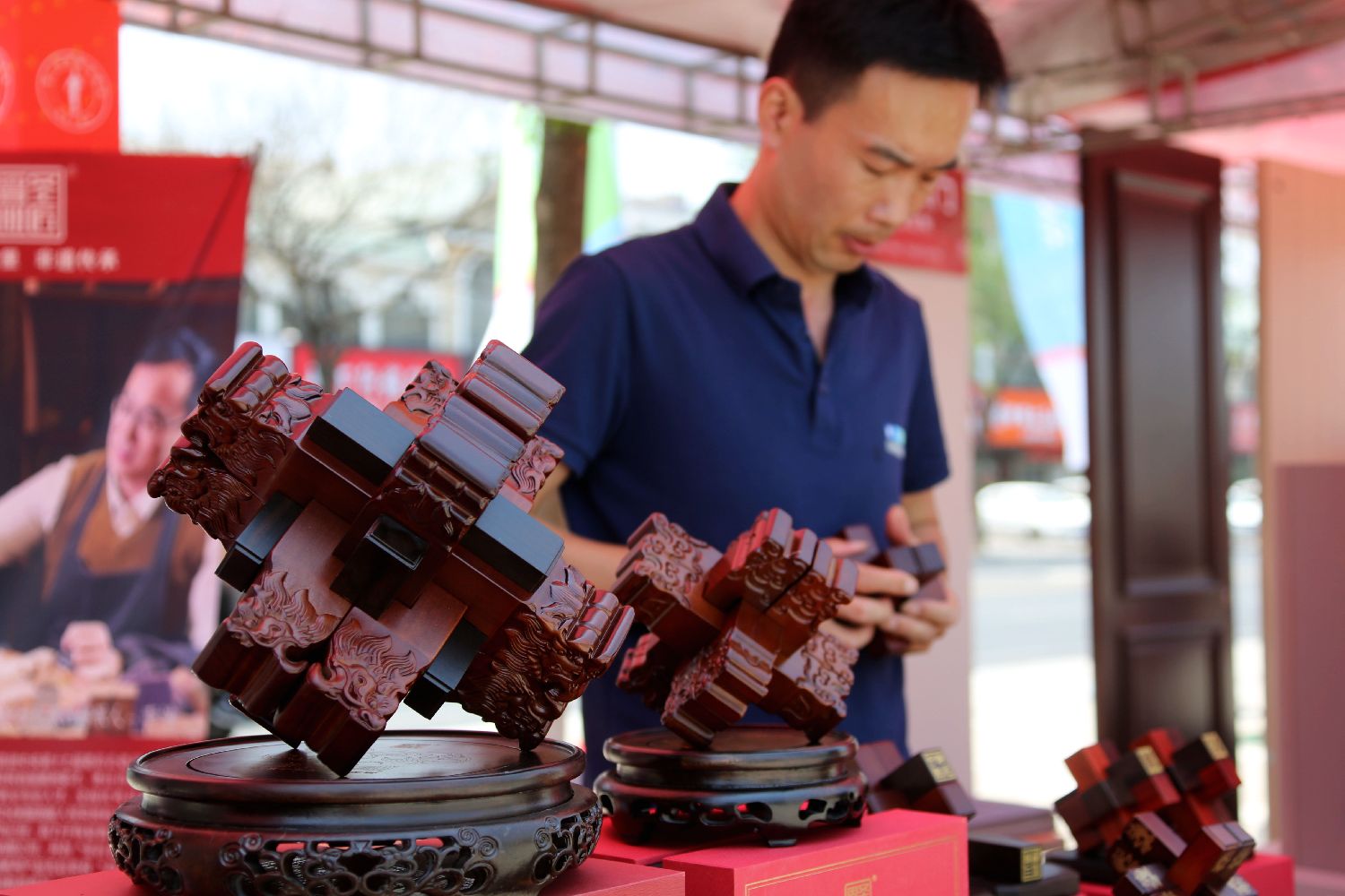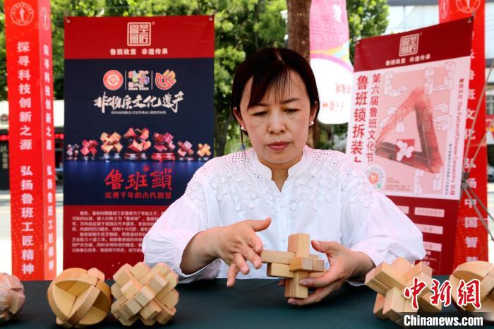 6月11日,中国山东滕州举行第六届鲁班文化节系列活动。图为展示传统鲁班锁。中新社