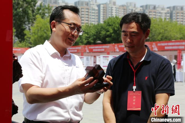 参加活动的商家(左一)向与会嘉宾介绍鲁班锁。中新网