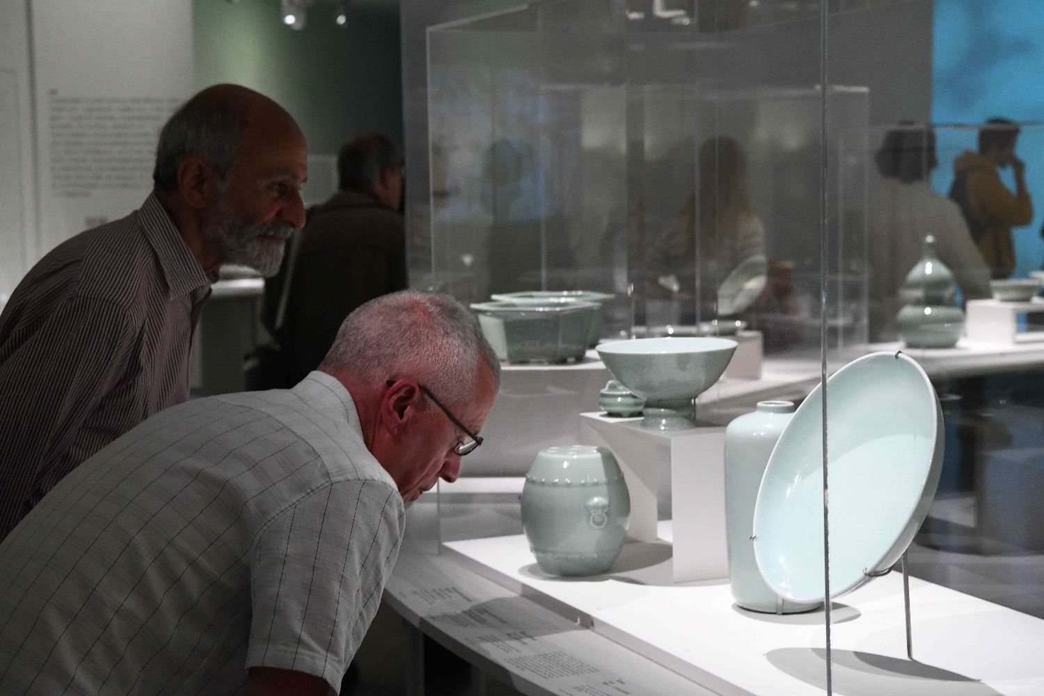 当地时间6月11日,参观者在仔细观看展出的中国瓷器精品。中新社