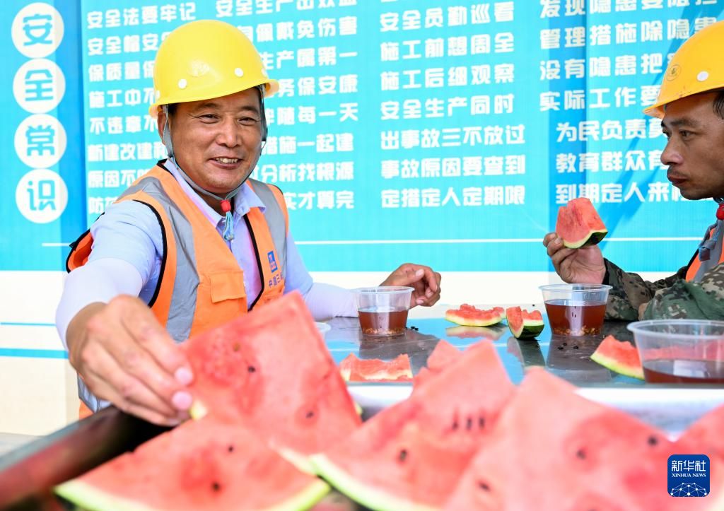 6月17日,在位于内蒙古呼和浩特市的中建三局内蒙古农业大学公寓楼项目施工现场,工人在吃西瓜。新华社