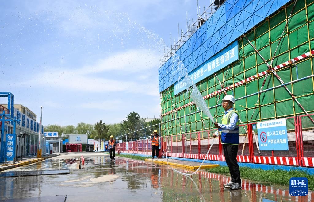 6月17日,管理人员在内蒙古呼和浩特市中建三局内蒙古农业大学公寓楼项目施工现场洒水降温。新华社