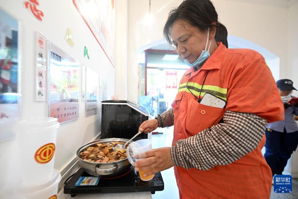 6月17日,环卫工人在天津市河北区望海楼街道一处工会驿站内盛酸梅汤。新华社