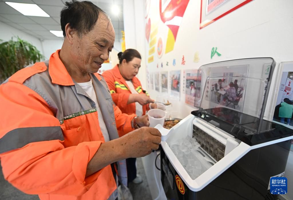 6月17日,环卫工人在天津市河北区望海楼街道一处工会驿站内盛冰块。新华社