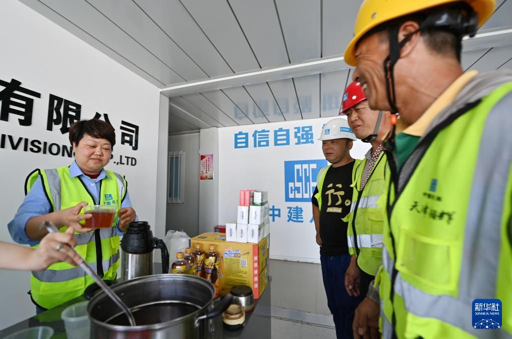 6月17日,在中建八局天津医科大学第二医院改扩建项目,工程管理人员为工友准备绿豆汤。新华社