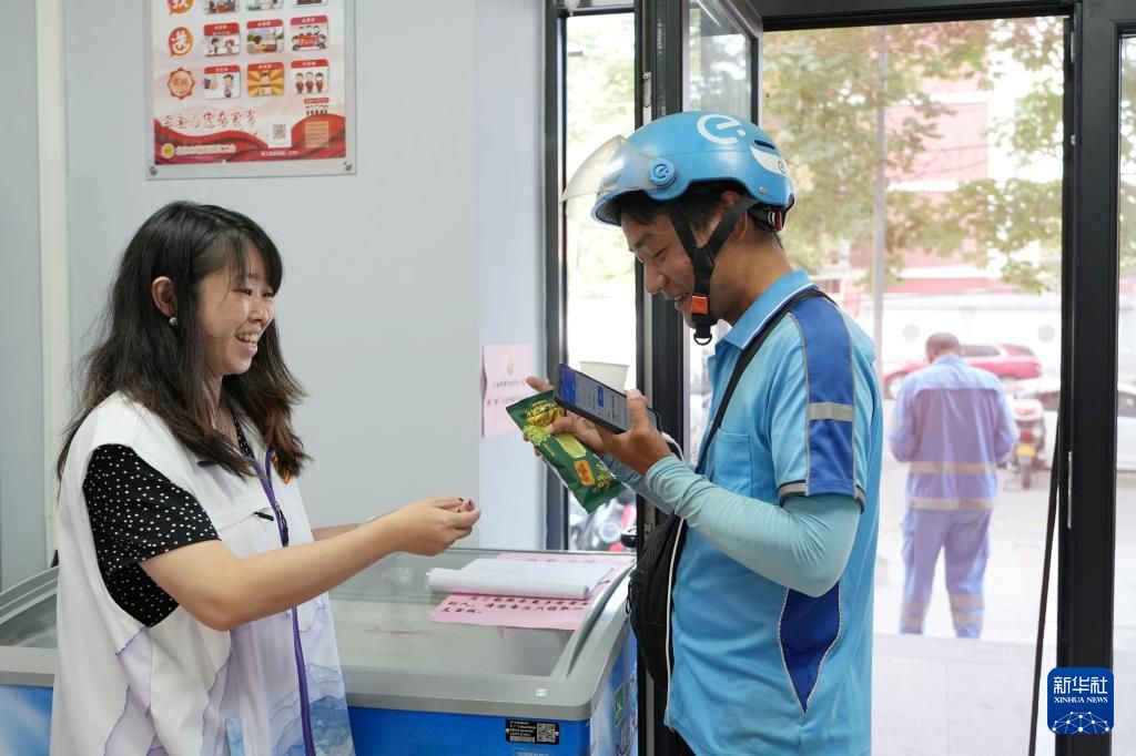 6月17日,在北京市朝阳区八里庄街道总工会的工会驿站内,一位工作人员为外卖小哥发放冷饮。新华社