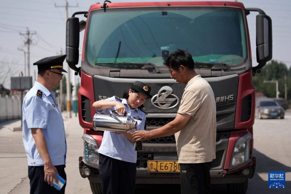 6月17日,河北省邢台市羊范联合治超站工作人员为货车司机送绿豆汤。新华社