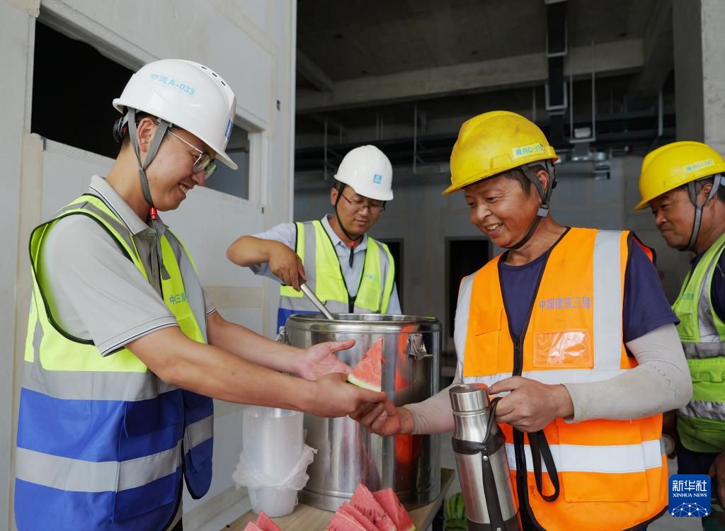 6月17日,在位于河南郑州的上海龙华医院河南医院项目工地,中建三局工程管理人员为工人发放西瓜与绿豆汤。新华社