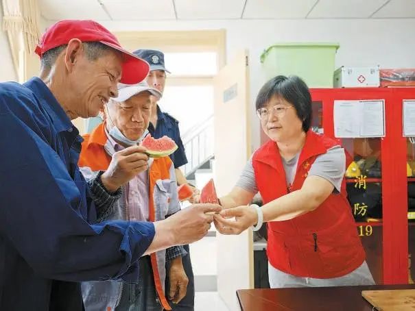北京市石景山区金顶街街道铸造村社区“暖蜂驿站”联合街道党群服务中心开展“关爱户外工作者送清凉”活动,为在炎热天气下工作的劳动者提供防暑降温保障。北京日报客户端