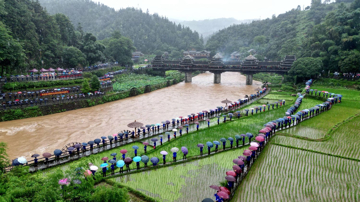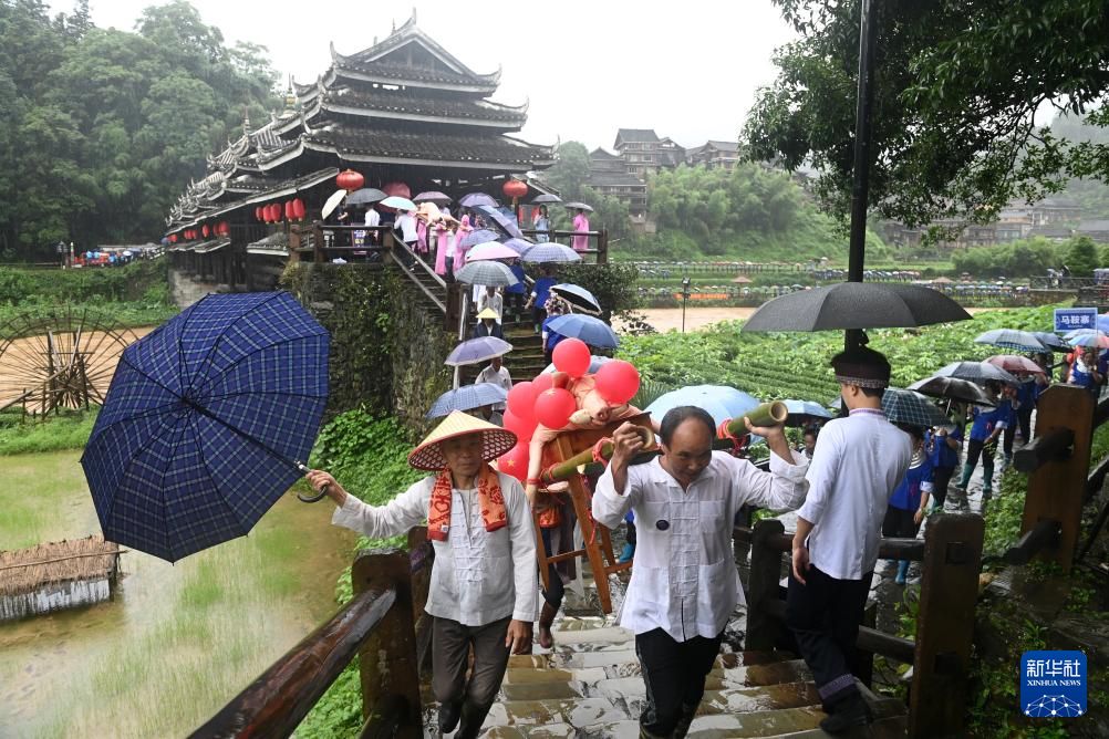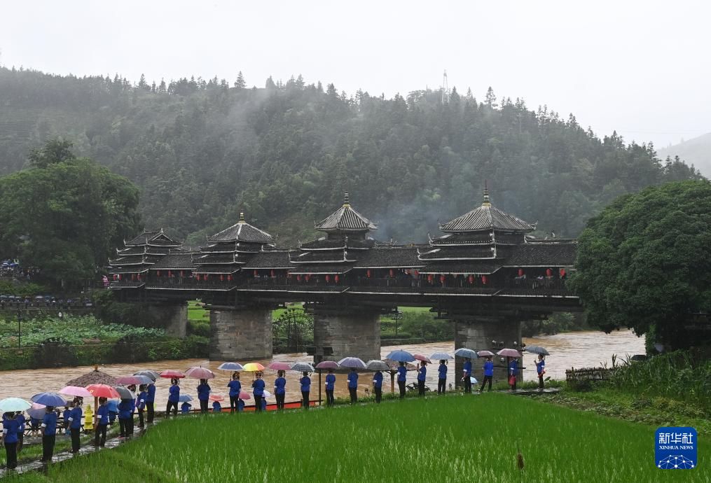 6月18日,在广西三江侗族自治县林溪镇程阳八寨景区,当地民众以民俗巡游、侗族大歌、多耶、讲款等丰富形式,欢庆程阳永济桥落成100周年。中新社