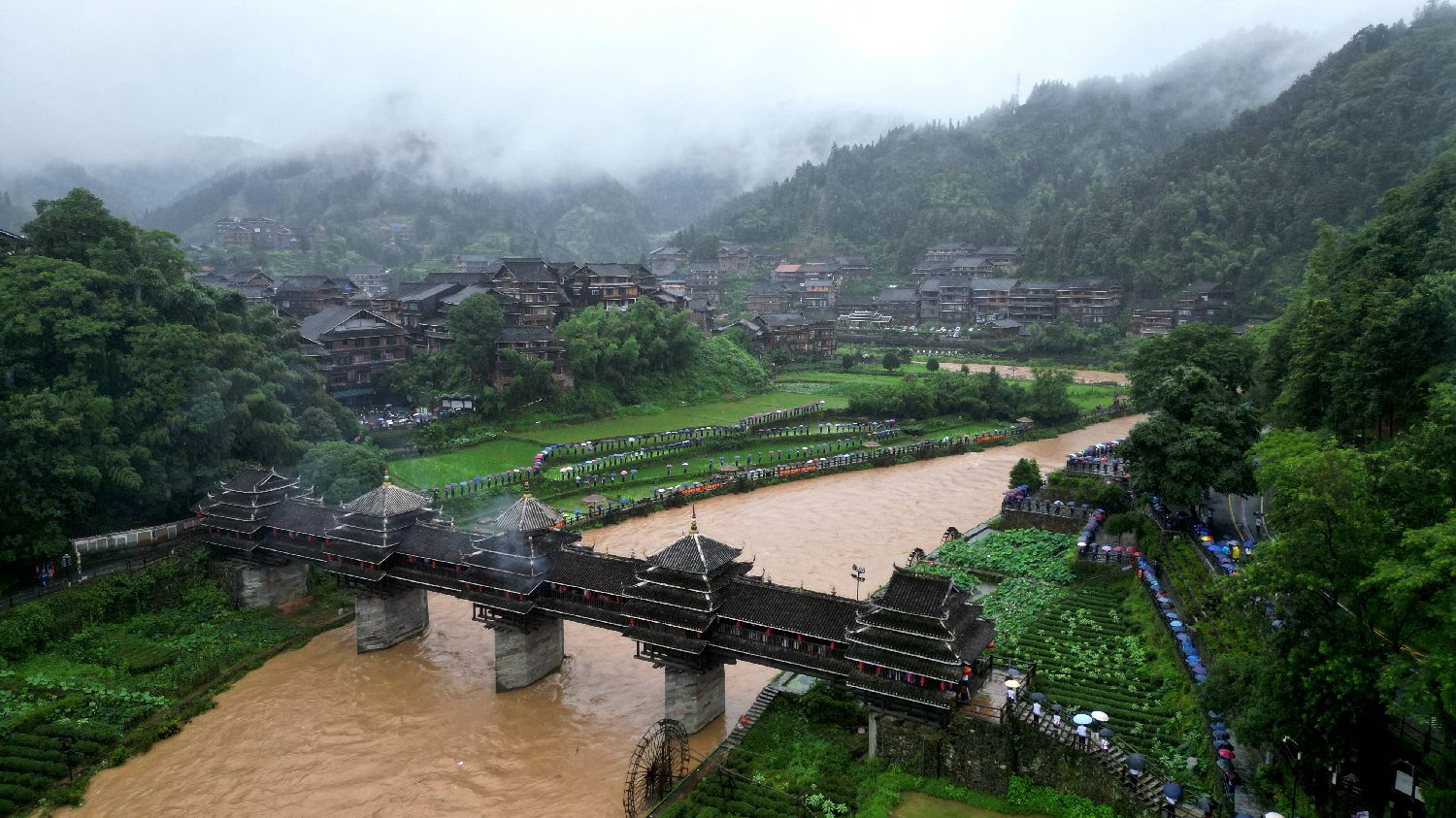 程阳风雨桥桥长77.76米,桥廊宽3.75米,桥墩基础至桥面高为11.52米,桥面至塔顶高为8.7米,墩台上建有5座塔式桥亭和19间桥廊,桥盖中央为六角攒尖挺颐式,东西亭为攒尖式,东西两端为歇山式,是中国木建筑中的艺术珍品。图为6月18日,航拍程阳风雨桥。中新社