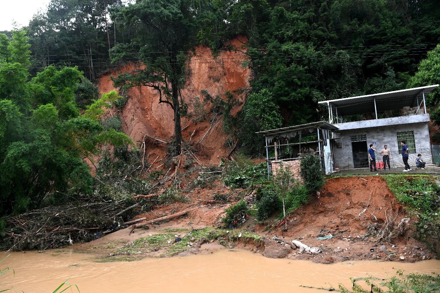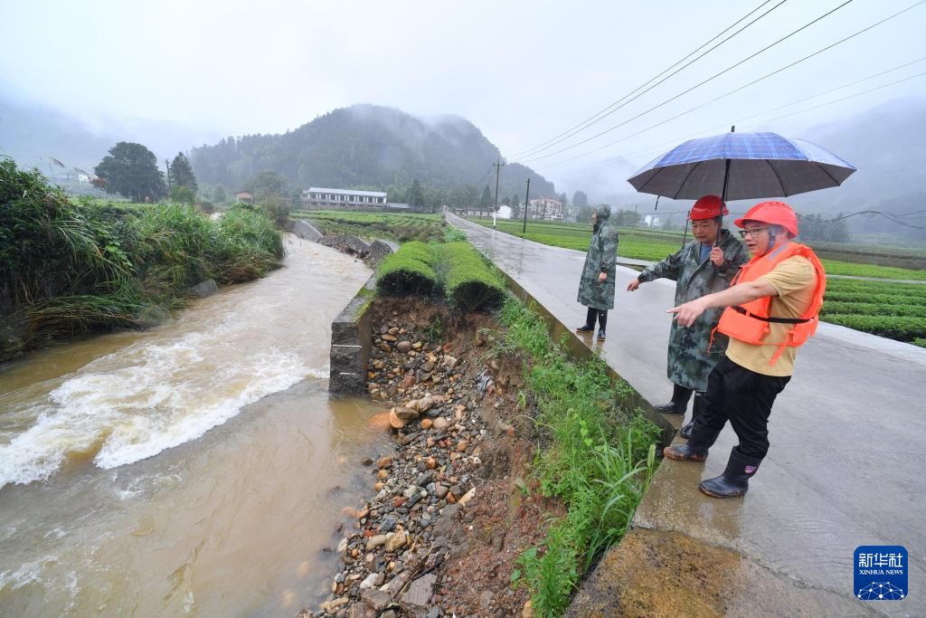 6月16日,福建南平武夷山市星村镇红星村防汛人员在查看溪边一处被洪水冲毁的茶园。新华社