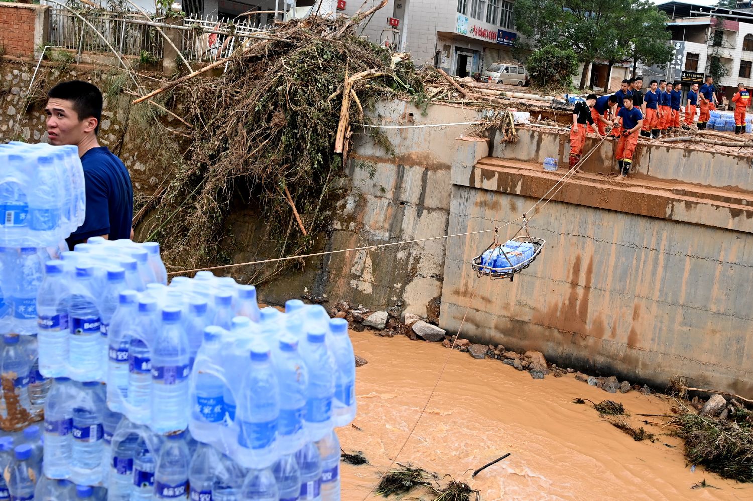 6月18日,在武平县中赤镇,因进入集镇主干道的“中赤一桥”被冲毁,救援人员正通过绳索把捐赠物资传送到河对岸。中新社