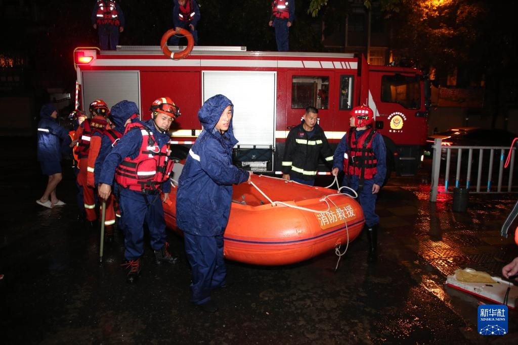 6月16日深夜,在福建省龙岩市新罗区九一南路,消防人员从消防车上卸下橡皮艇准备救援。新华社