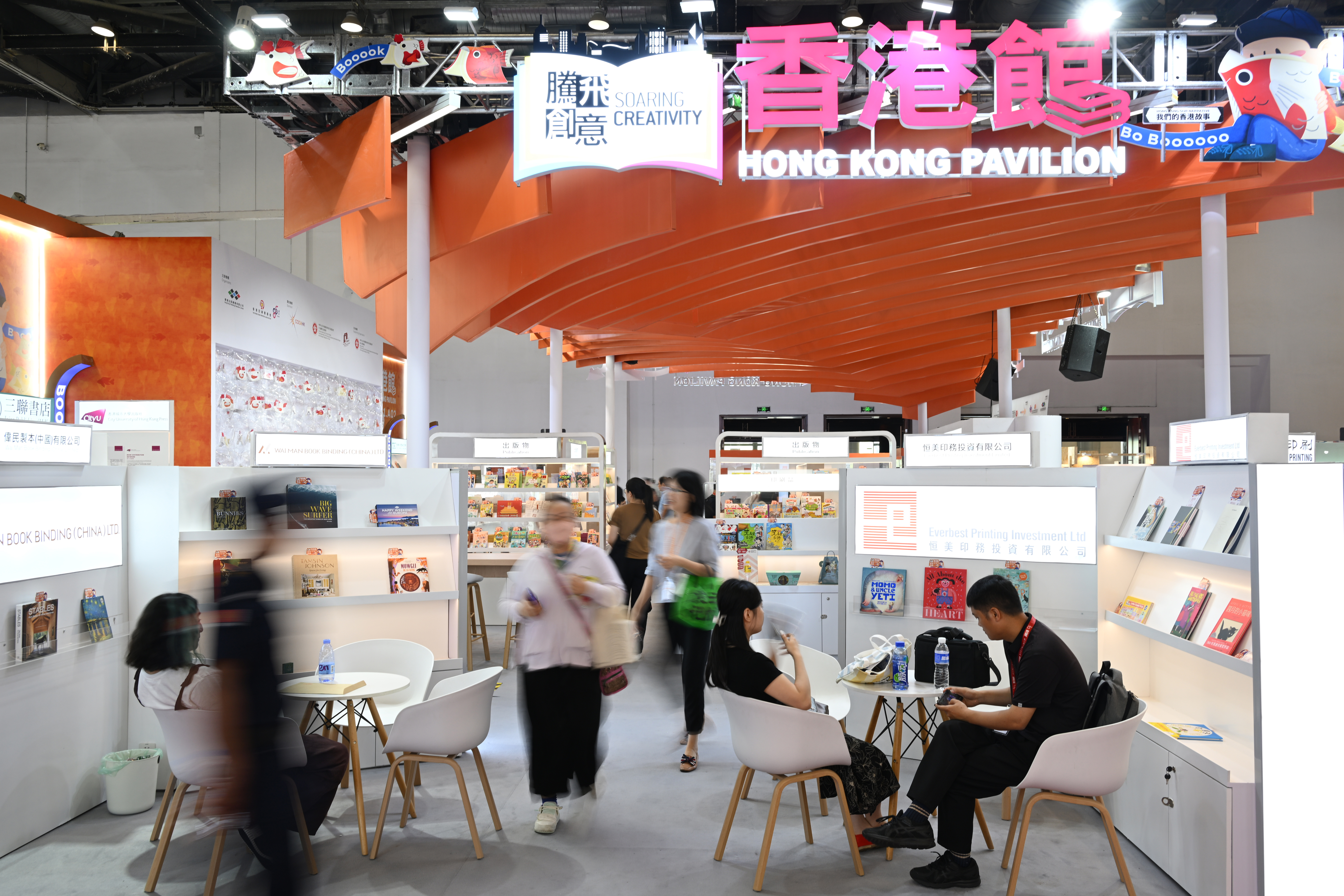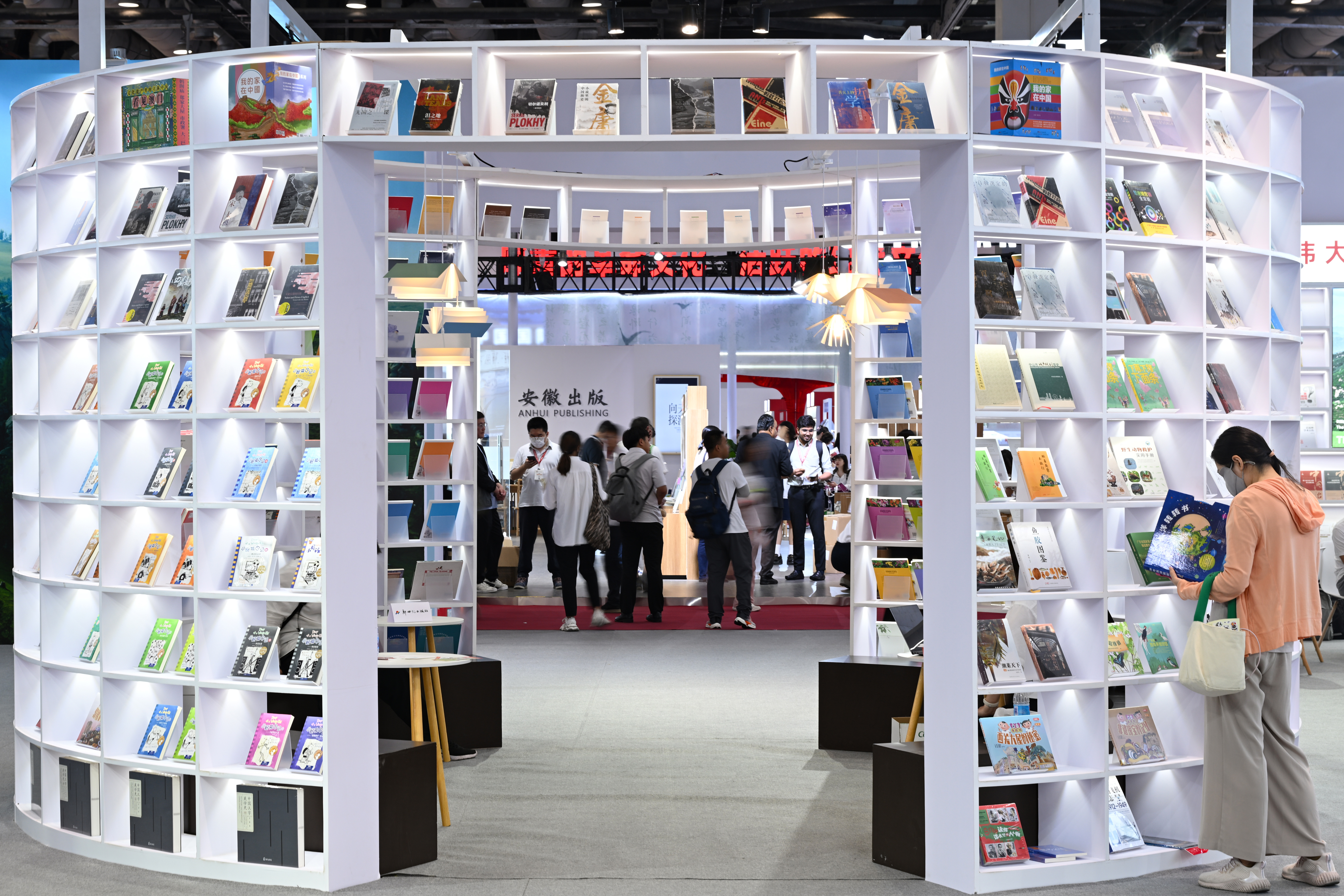 6月19日,观众在香港馆参观、购书。中新社