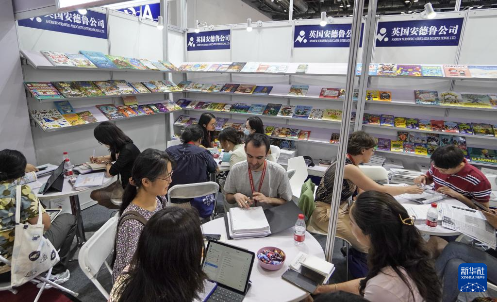 6月19日,中外出版商在博览会上洽谈业务。新华社