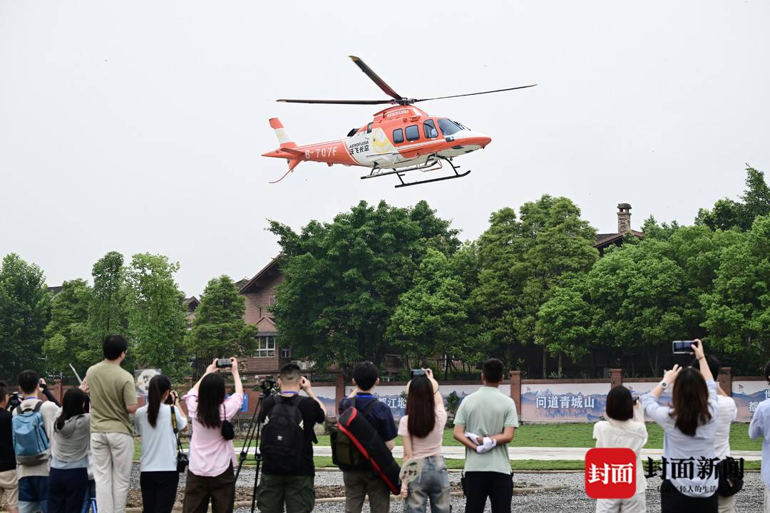 媒体记者拍摄城市低空载人直升飞机。成都“封面新闻”