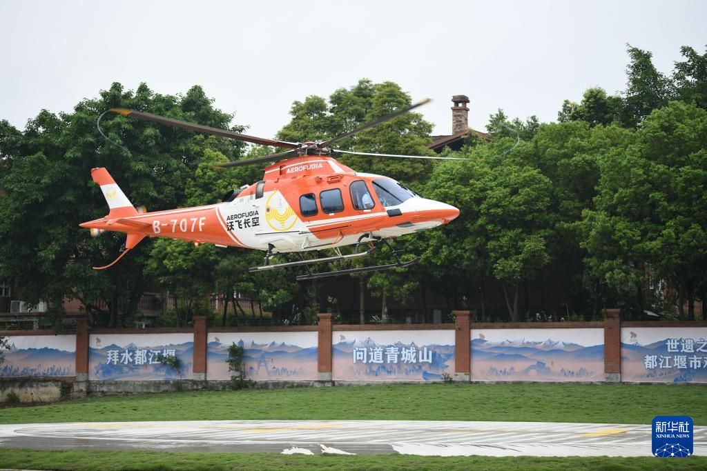 6月20日,一架阿古斯塔AW109型载人直升机经过两次成都市域内的往返飞行,完成了成都市城市低空载人出行验证飞行任务,对成都市低空交通管理服务平台进行了首次运行保障检验,探索了成都低空经济的应用场景。据悉,本次飞行活动由沃飞长空执飞,在中国首次完成同一城市两个大型繁忙民用运输机场间的直升机低空目视航线互通,实现了双机场场内运输飞行和通航飞行同时运行。图为6月20日在成都都江堰市青城山起降点拍摄的参与验证飞行的载人直升机。新华社